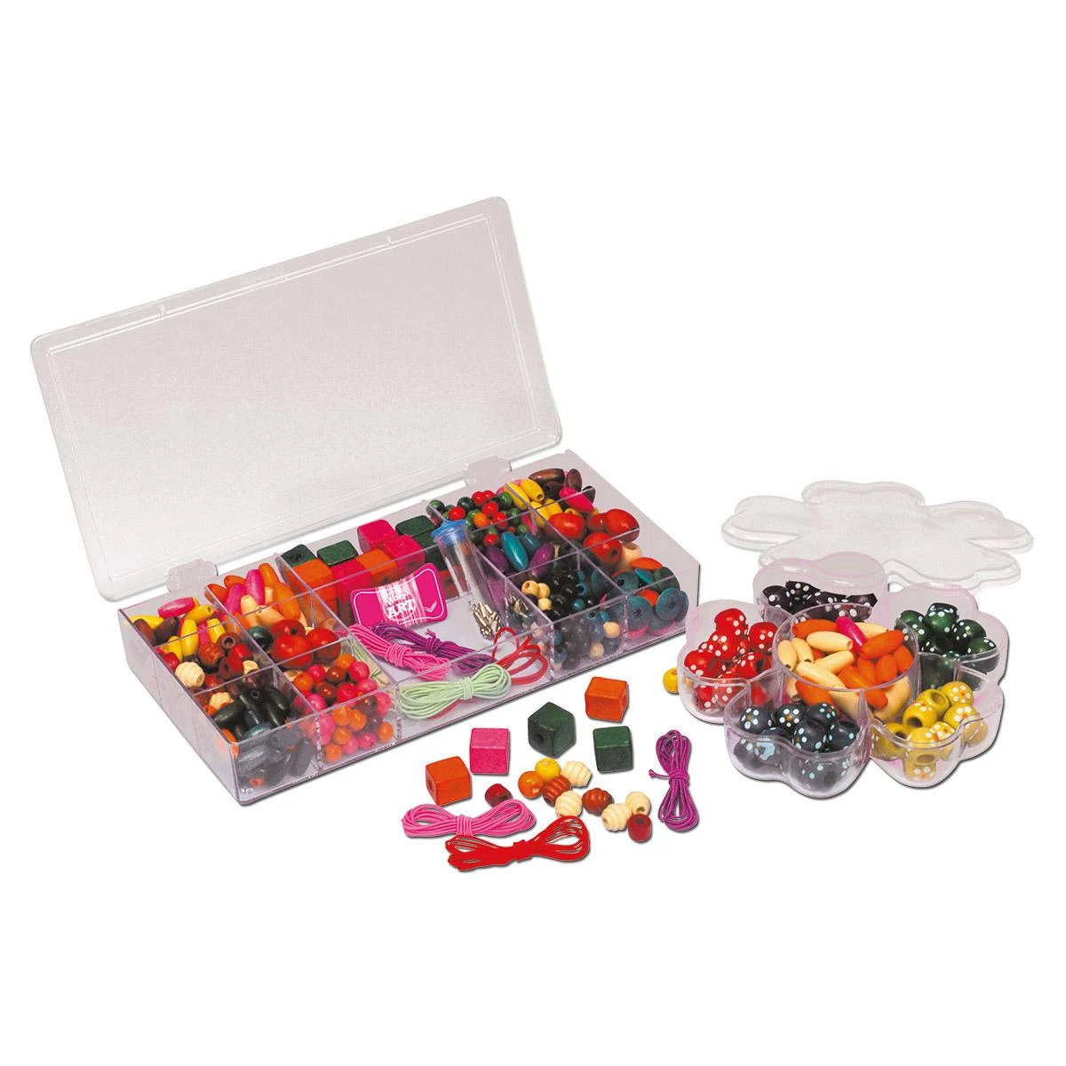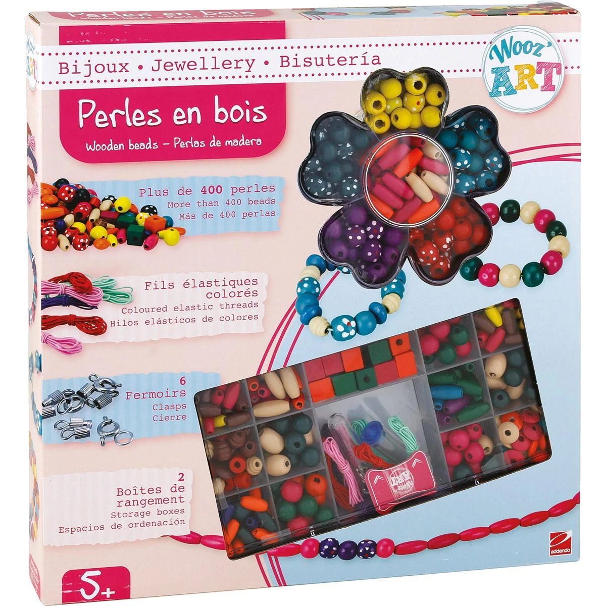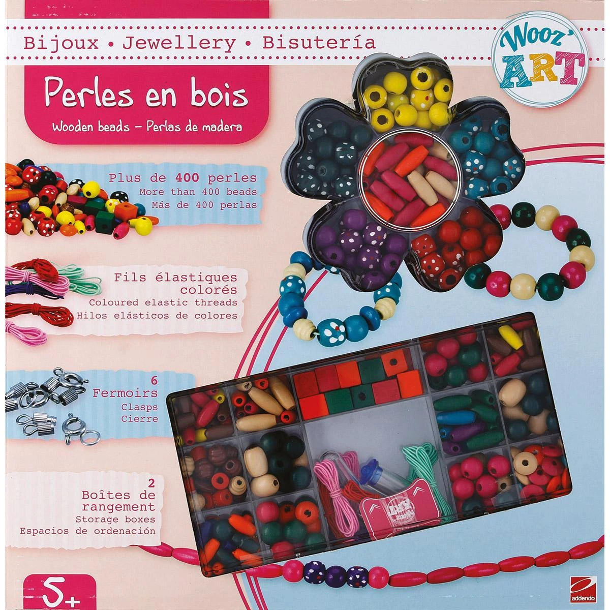 Contient : plus de 400 perles, Fils élastiques, 6 fermoirs, 2 boites de rangement.