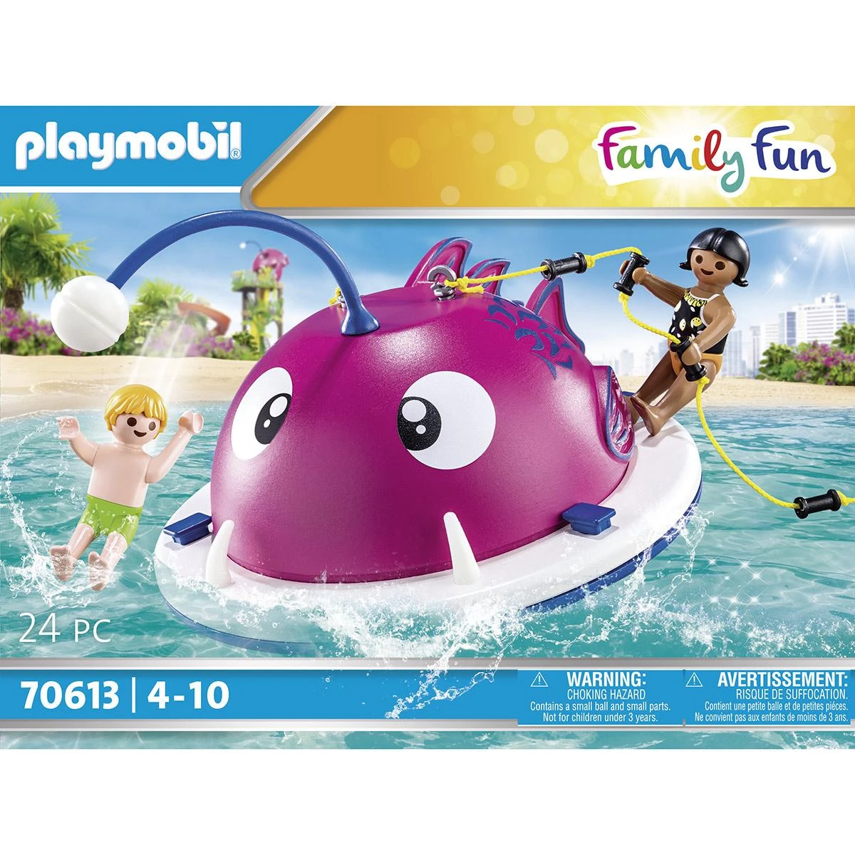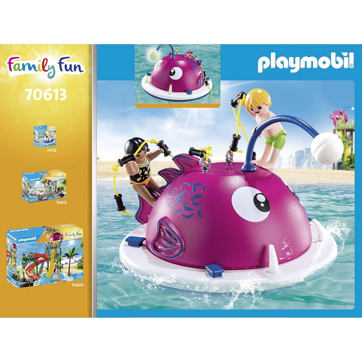 Le coffret Aire de jeu aquatique Playmobil Family Fun 70613 contient deux personnages et une bouée géante qui flotte et s’illumine.