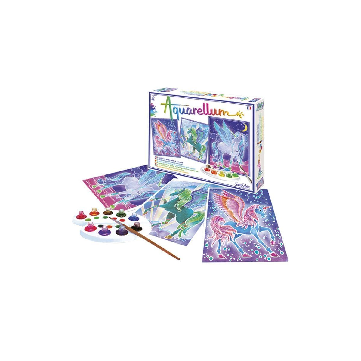Muni de sa palette et de son pinceau aquarelle, votre enfant concentre toute son attention sur la combinaison des couleurs pour réaliser le plus beau des Aquarellum Pégase. Avec la technique de sertissage Aquarellum, de Sentosphère, qui lui permet de ne pas déborder, il s’initie à une nouvelle manière de peindre et plonge dans l’univers des animaux mythiques ! Le coffret Aquarellum Pégase renferme 3 tableaux pour 3 variations autour du cheval ailé, Pégase. Votre artiste en herbe développe sa créativité en peignant son Aquarellum Pégase… Préparez-vous à organiser une exposition de ses créations pour toute la famille !