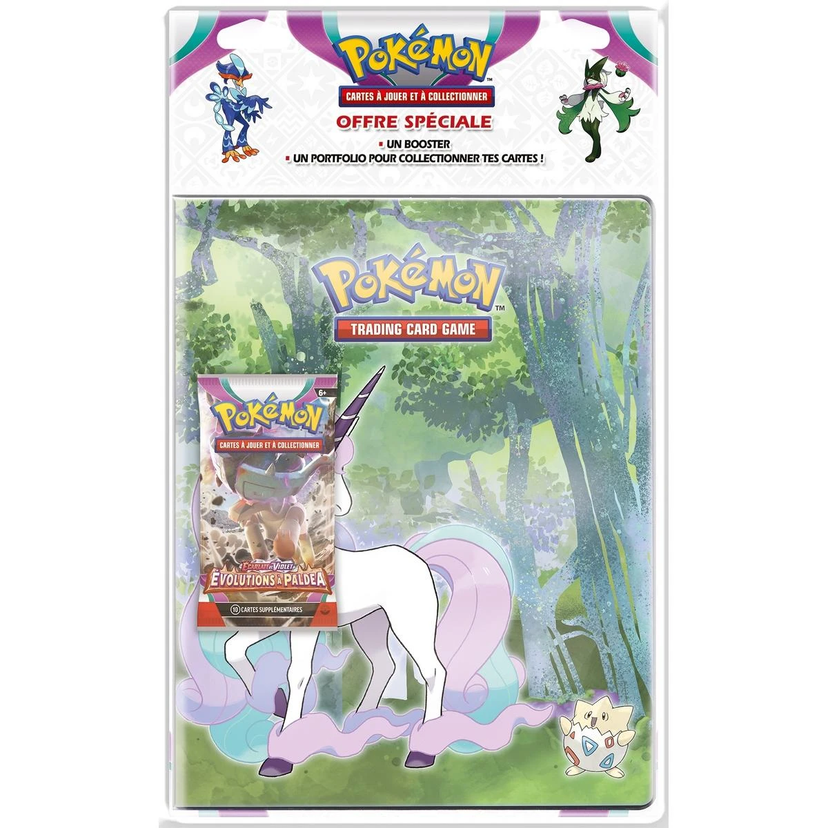 Le Pack portfolio Pokémon Écarlate et Violet – Évolution à Paldea contient 1 cahier range-cartes pour 180 cartes et 1 booster Écarlate et Violet – Évolutions à Paldea de 10 cartes.