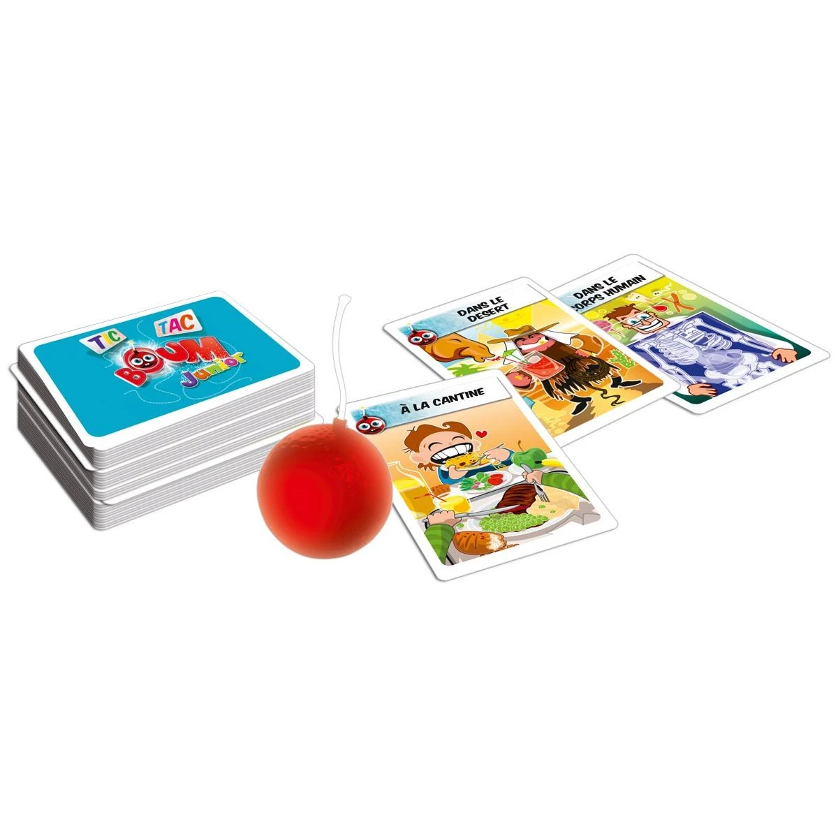 Tic, tac, tic tac… On rie comme des fous avec Tic Tac Boum Junior ! La bombe tourne entre les joueurs au son de son tic tac « menaçant ». Tu l’as entre les mains ? Vite, vite, vite, prononce un mot en rapport avec le thème de la carte piochée pour le tour et passe la bombe à ton voisin. Tic, tac, tic tac… À tout moment le tic tac peut s’interrompre et la bombe exploser ! Sois rapide pour ne pas perdre. Tic, tac, tic tac… Un compte à rebours terriblement drôle où un seul bon mot te sauve de l’explosion… de rires ! Tic Tac Boom Junior un jeu à offrir à s’offrir… du tac au tac !