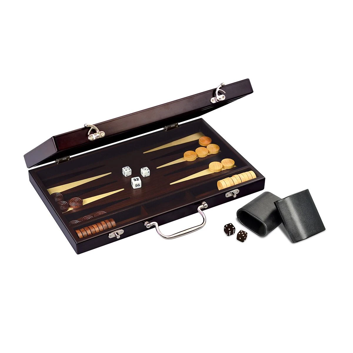 Découvrez ou redécouvrez le plaisir de jouer au Backgammon avec ce Backgammon Deluxe en bois avec fermeture et poignée en métal. Contient : 30 pièces en bois, 4 dès, 1 cube, 2 agitateurs en simili cuir et une notice. Particularité : mallette pliable facile à transporter. 2 joueurs. Dès 6 ans.