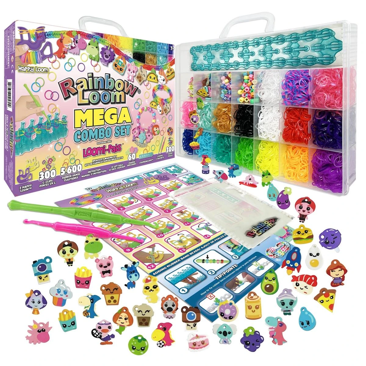 2 Happy Loom, 300 pinces en C, 5600 élastiques, 12 sacs cadeaux, 60 breloques, 1 rainbowloom, 2 crochets, 300 perles.