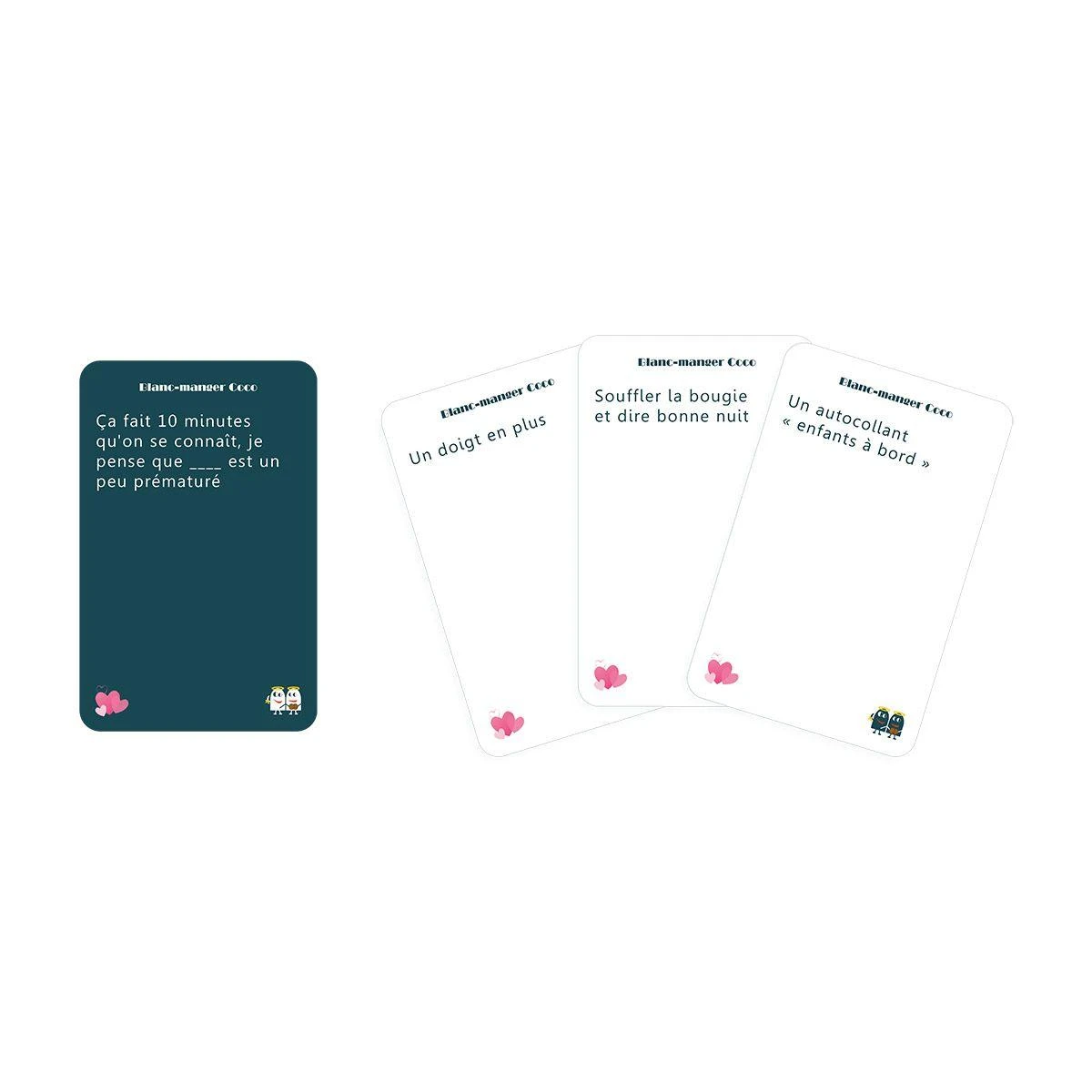 Blanc Manger Coco, c’est l’irrévérence et le politiquement incorrect dans une boîte. Le jeu Blanc manger coco : la petite gâterie de Blackrock propose 600 nouvelles cartes plus coquines. Chaque joueur dispose de 11 cartes réponse. Un premier joueur, le « question master », va piocher et lire une carte question à voix haute. Il s’agit d’une phrase à trou. Les autres joueurs posent une carte réponse pour compléter la phrase. Chaque combinaison est lue une à une par le « question master » qui ne sait pas qui a posé quelle carte. Celle qu’il préfère, généralement celle qui donne la phrase la plus décalée, permet à son auteur de remporter un point. Les cartes question et cartes réponse sont généralement neutres. C’est l’association des deux qui donne un cocktail détonnant.