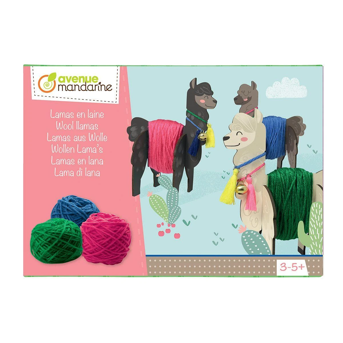Comprend 3 lamas en carton à monter, 3 pelotes de laine, une notice.