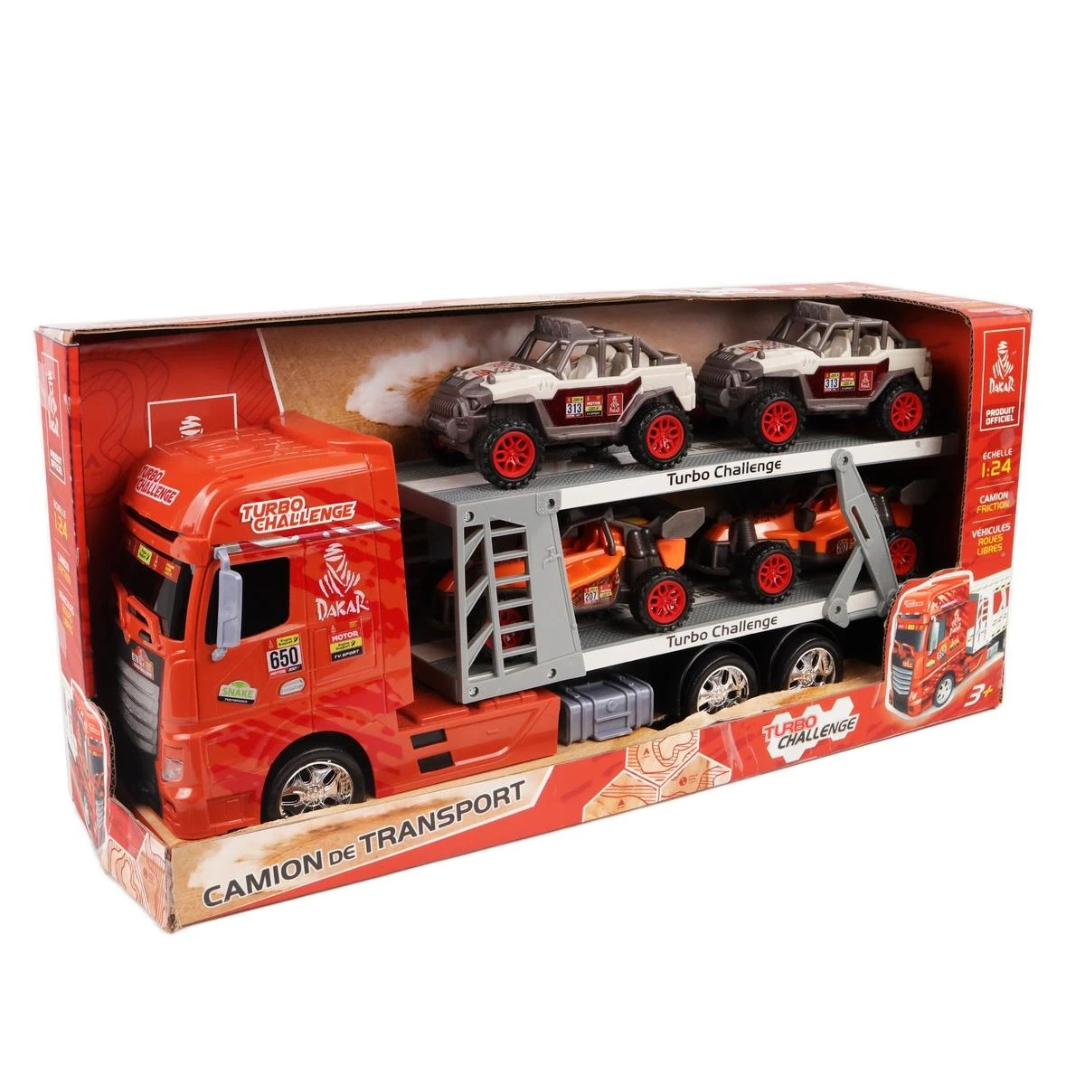 Un beau « bébé » le Camion de transport Dakar rétrofriction qui incite à partir à l’aventure avec à son bord 4 véhicules tout-terrain à roues libres ! Malgré son gabarit, il roule vite grâce au système de rétro-friction et sait se faufiler car il tient bien la route avec ses gros pneus.