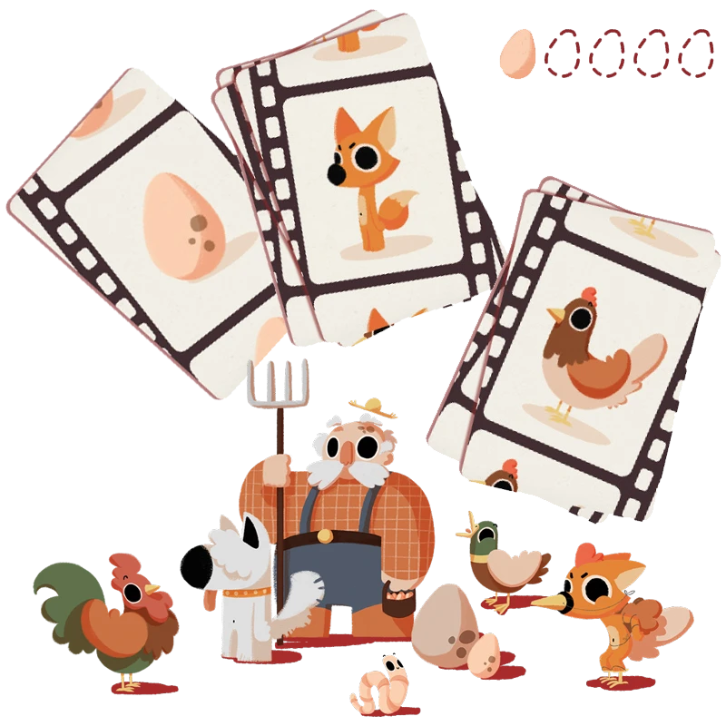 Soyez le premier à taper sur le tas de cartes dès qu’il y a 5 œufs empilés.. facile ? Détrompez-vous ! Des perturbateurs viennent chambouler votre comptage avec chacun une action particulière qui lui est attribuée : la poule vient couver son œuf (et donc le rendre indisponible), le renard vient chasser la poule de la basse-cour (l’œuf redevient disponible). On en parle du renard qui se déguise en poule ?! Le jeu d’ambiance Poule Poule promet de bonnes parties de rigolades en famille ou entre amis !