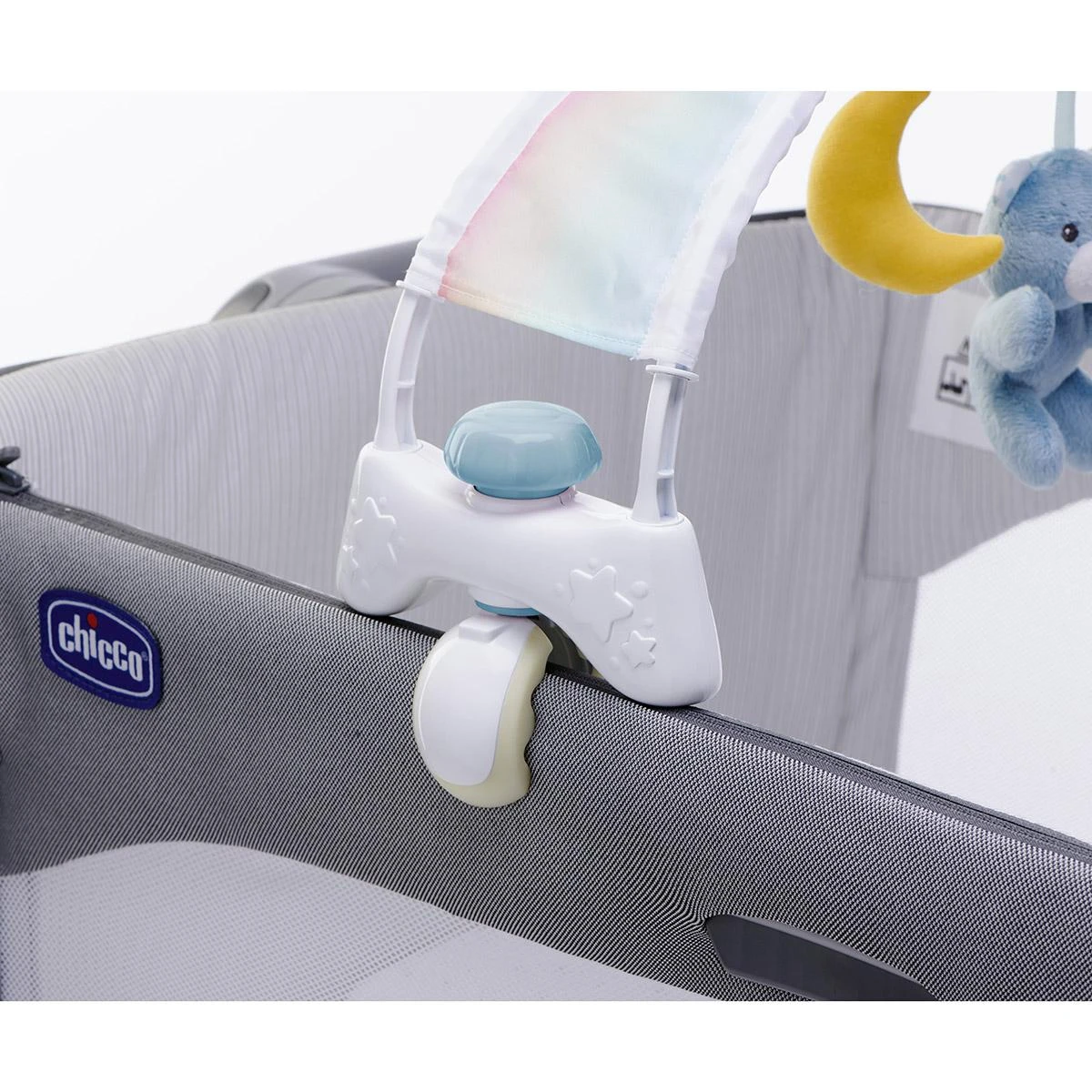 L’arche arc-en-ciel bleue de Chicco est idéale pour les siestes et les nuits de votre tout-petit. Elle est accompagnée d’une veilleuse lumineuse amovible et portable. L’arche est également composée de 3 mobiles en peluche. La veilleuse peut être utilisée avec l’arche pour les premiers mois de l’enfant et seule par la suite.