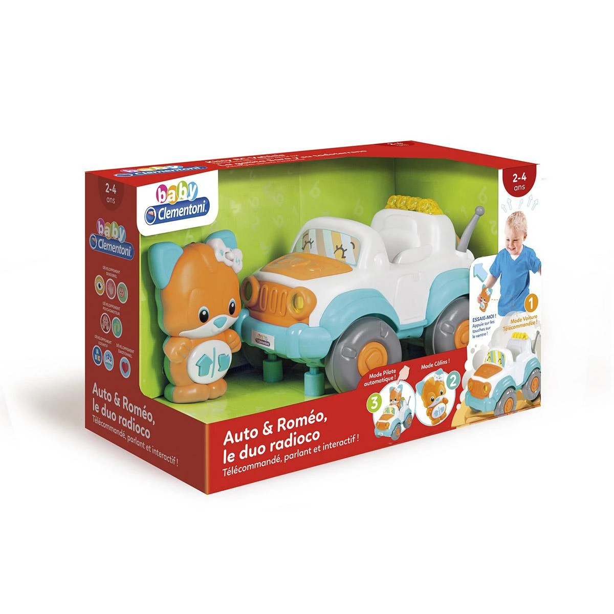 Votre enfant va adorer l’Auto & Roméo – le duo radioco de Clementoni, une jolie voiture et son chaton-radiocommandé ! Le chaton peut être utilisé seul. Il chante des chansons et fait des sons amusants lorsque l’on appuie sur ses boutons. En mode télécommande, il permet de faire rouler son compagnon en avant et en arrière. Placez-le à l’intérieur du véhicule pour activer le mode Pilotage automatique ! La voiture se déplace et chante alors toute seule.