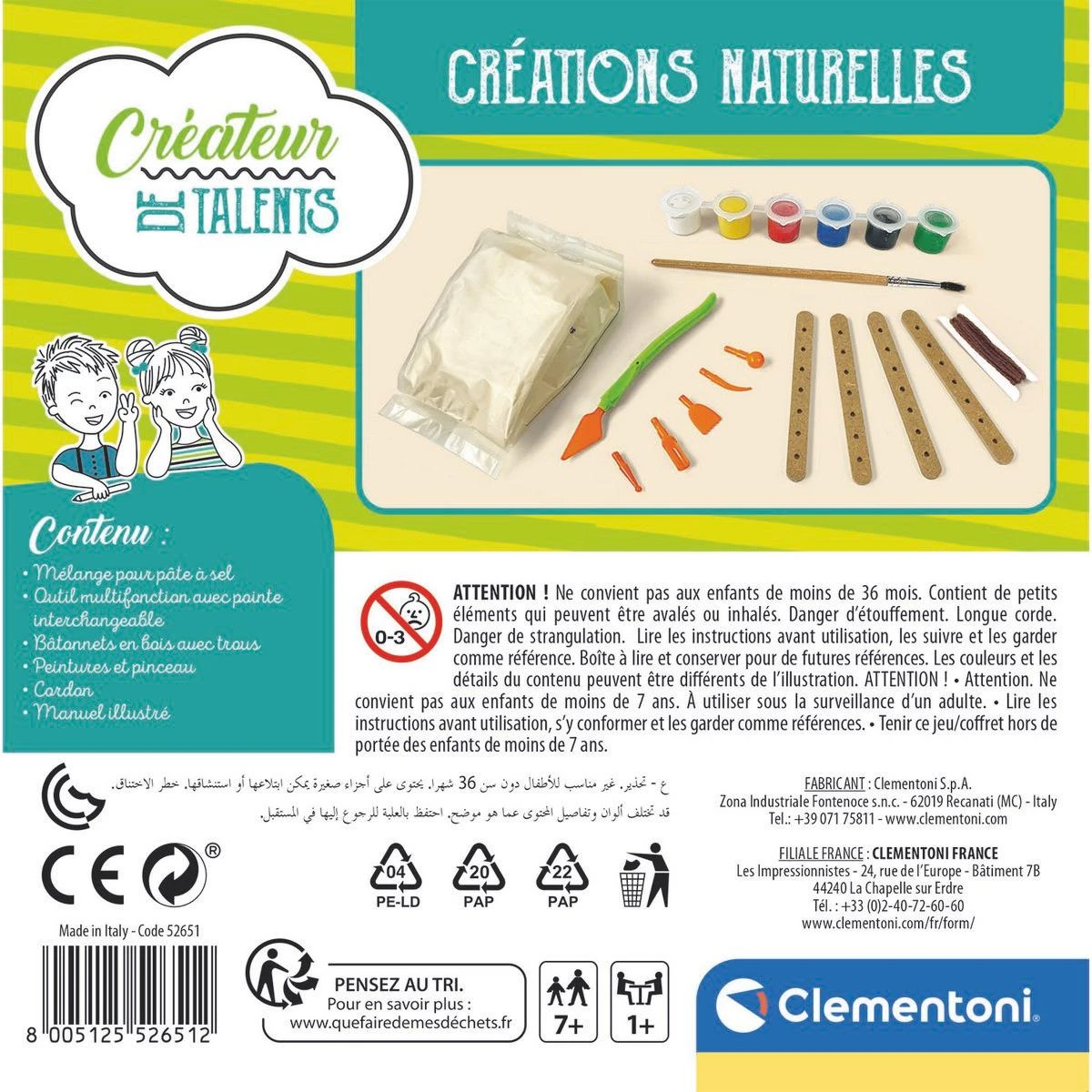 Créations Naturelles c’est toute la nature dans un coffret original pour s’amuser en laissant libre cours à sa créativité ! Tous les ingrédients pour jouer avec de la pâte à sel et réaliser un superbe pot à stylos à décorer avec des éléments naturels (pomme de pain, marron, feuilles), de la peinture et un pinceau. Grâce aux baguettes en bois et aux rubans, votre enfant s’amuse à réaliser avec le coffret Créations Naturelles des carillons pour décorer sa chambre. Pour découvrir la force du vent, pourquoi ne pas réaliser un moulin en carton orné de graines colorées ?