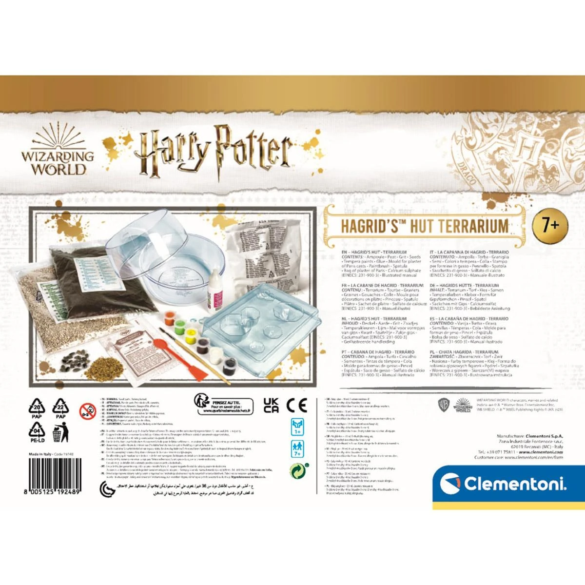 Avec ce Terrarium Harry Potter de Clementoni, découvrez un coffret fantastique ! Et créez un écosystème miniature avec un décor magique, dans le plus pur style de Harry Potter ! Un jeu qui permet aux enfants de s’amuser tout en apprenant l’importance de prendre soin de leurs plantes. Contient du plâtre de Paris, des moules et la peinture pour reproduire la très jolie cabane de Hagrid avec ses citrouilles caractéristiques. Les enfants utilisent les graines, la tourbe, la terre, le sable et les pierres pour faire pousser un paysage naturel rempli de plantes autour de Poudlard. Un jeu personnalisable idéal pour décorer la chambre de tous les fans d’Harry Potter.
