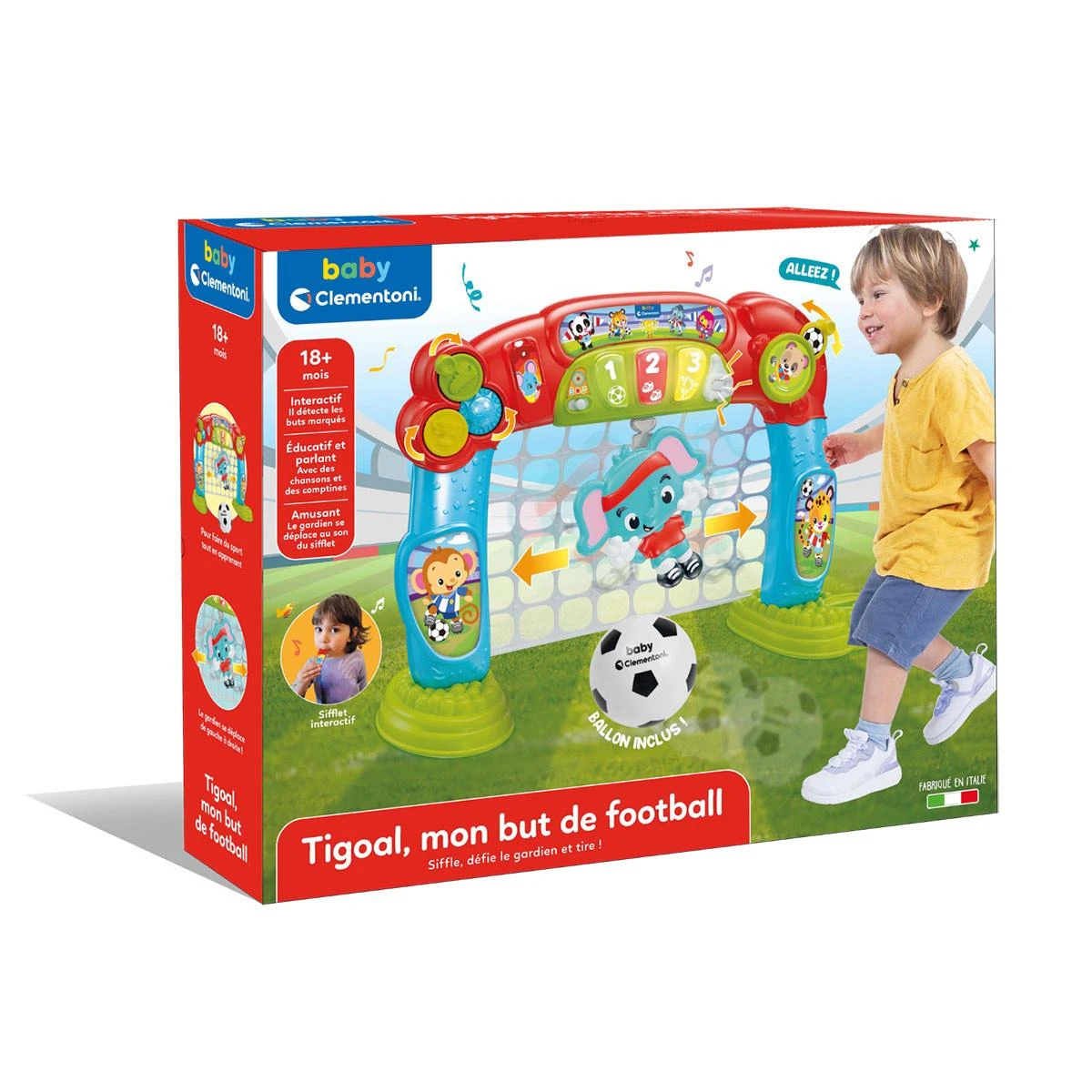 Coup d’envoi ! Le gardien de but reconnaît le coup de sifflet et se déplace de gauche à droite. Votre enfant marque un but et devient un champion ! Tigoal, mon but de football de Clementoni est aussi un centre d’activités. Avec lui, le plaisir s’invite sur le terrain !