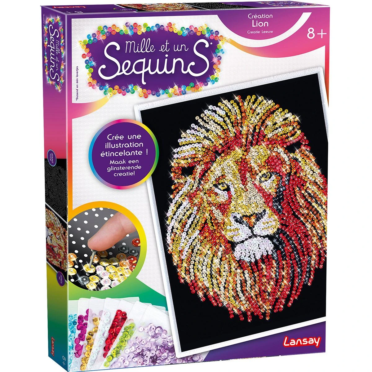 Réalise des créations étincelantes avec le coffret Mille et Un Sequins Lion de Lansay ! Tu trouveras dans ce kit une image pré-imprimée d’un magnifique lion avec une plaque de polystyrène qui sert de cadre et de base pour pouvoir fixer les sequins à l’aide de petits clous. Les couleurs de l’illustration sont imprimées sur l’image, afin que tu puisses facilement identifier les sequins correspondants et les positionner pour faire scintiller ton illustration !