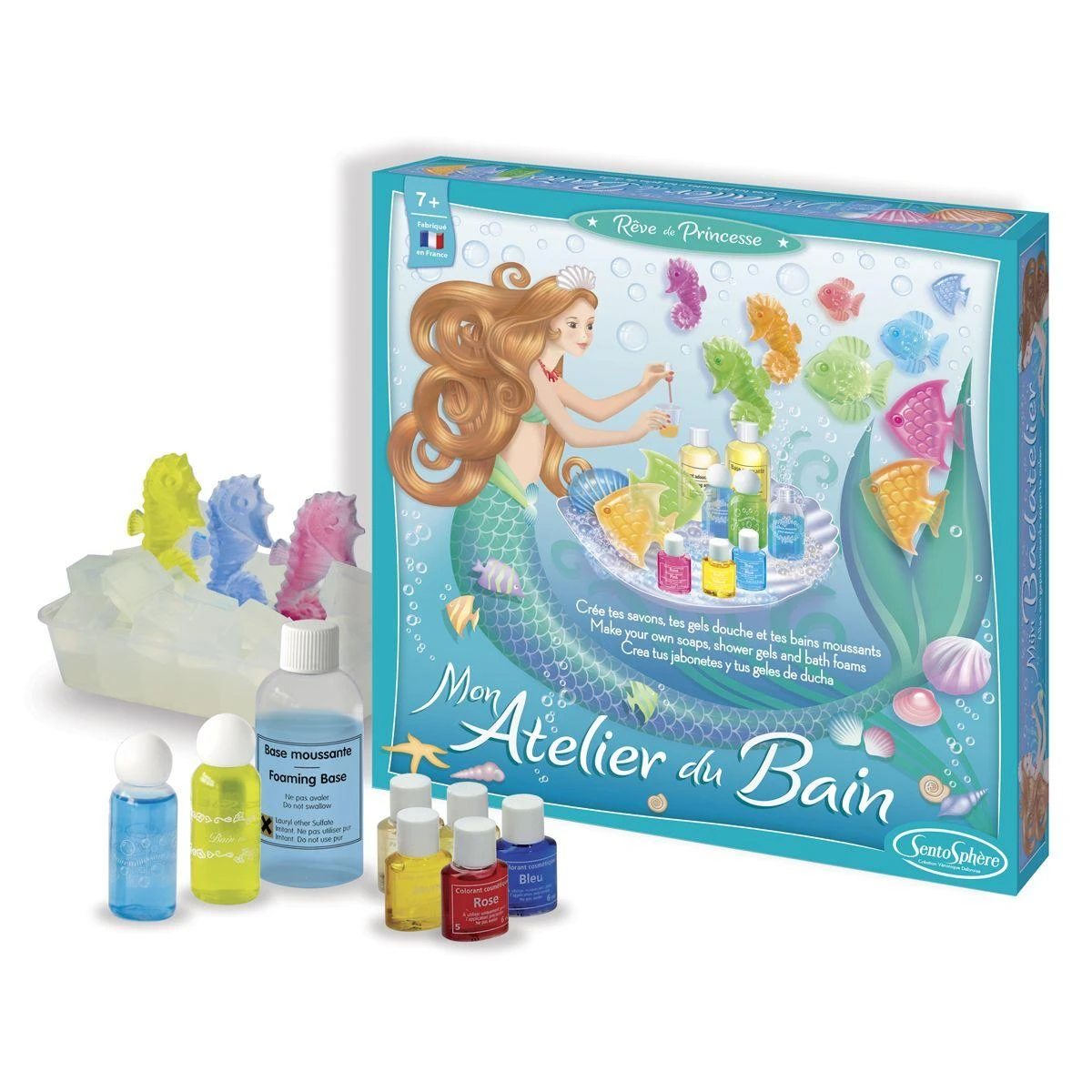 Ce coffret contient : des pipettes, des bases de savons, des flacons, des moules, un doseurs et un guide « L’atelier du bain ».
