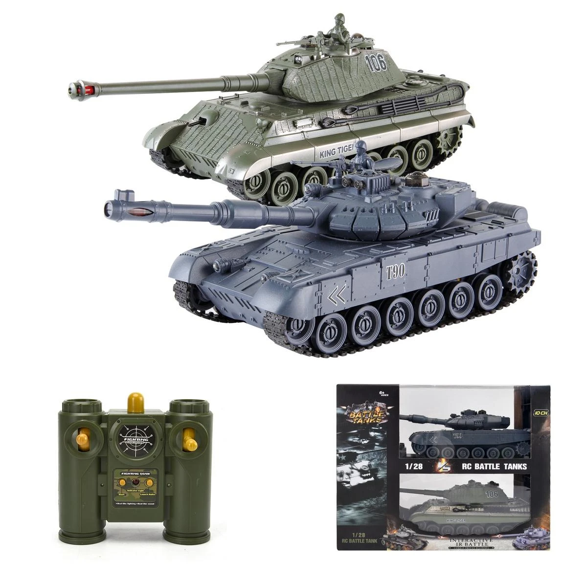 Comprend 2 tanks avec radiocommande toutes fonctions. Echelle : 1/28ème Fréquence: 2.4 GHz. Particularités: bataille de tank, effets sonores