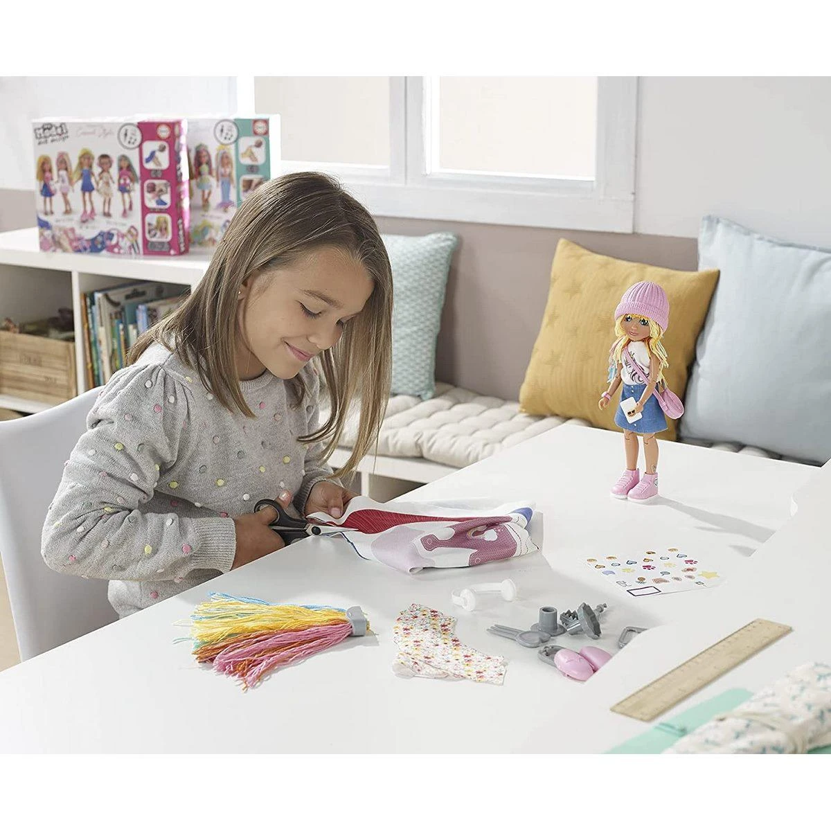Les petits stylistes montrent leur sens de l’imagination dans leur propre style. Pour la coiffure, ils se servent des fils de laine afin de créer les cheveux et les coupent ensuite pour avoir des coiffures originales et extraordinaires. Quant aux vêtements, ils sont faciles à confectionner. Le styliste n’a plus à coudre. Les vêtements s’assemblent au poignet. Pour finir, il y a un large choix d’accessoires assortis aux vêtements comme les chaussures, les sacs, les bijoux, etc. Après l’avoir habillé, la poupée stylée est prête pour les photos. Elle est articulée et peut prendre différentes poses. Le coffret My model doll design casual contient une poupée articulée, une bande de tissu aux motifs imprimés, divers accessoires de modes, des clips pour vêtements, du fil pour les cheveux, un petit outil pour perforer le tissu et une instruction.