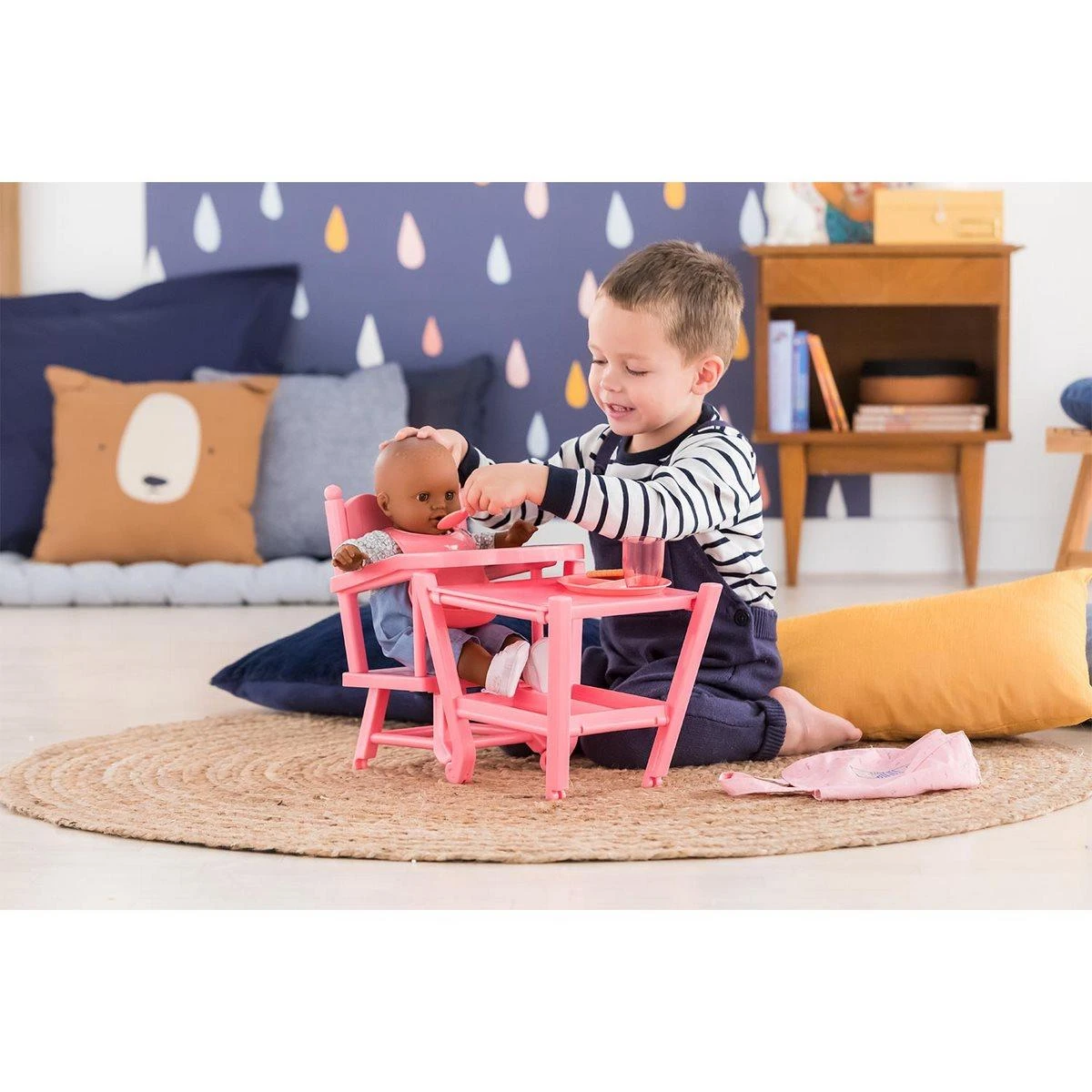 À taaaaable ! La Chaise Haute rose Mon Grand Poupon est adaptée aux grands poupons de 36 à 42 cm Corolle. 2 en1, elle se place en position haute comme celle d’un vrai bébé, ou en position basse pour faciliter le jeu assis. Sur sa petite tablette, on peut poser le repas de son grand poupon. Votre enfant va adorer nourrir son poupon pour qu’il devienne encore plus grand ! Bon à savoir, en plus de La Chaise Haute rose les poupons Corolle disposent d’une collection variée de vêtements et d’accessoires originaux afin d’offrir un maximum d’idées de jeux et de plaisir à votre enfant. Quelqu’un aurait vu le bavoir du poupon ?