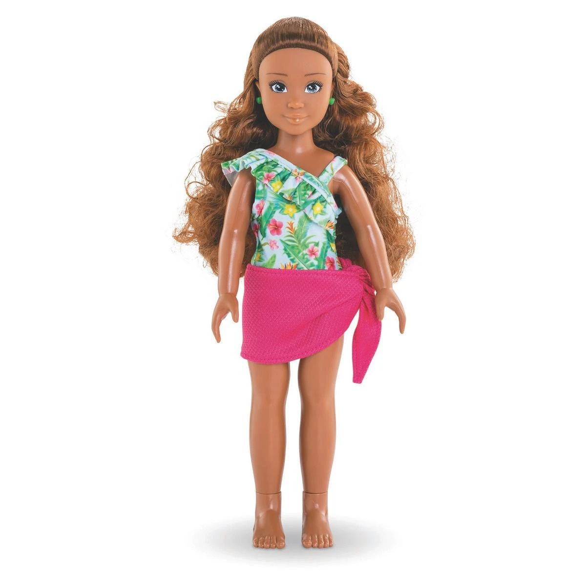 Melody fait partie d’un groupe d’amies composé de quatre adolescentes passionnées et aventureuses. Les Corolle Girls, dont Zoé, Luna, Mélody et Valentine, sont des poupées mannequins de la marque Corolle. Elles font rêver les petites filles qui souhaitent devenir d’aussi belles et jolies demoiselles. Le Corolle Girls : Coffret Melody à la plage est composé d’une poupée mannequin de 28 cm appelée Melody et de quelques accessoires de plage : de la crème solaire, des lunettes de soleil, une gourde, une serviette de plage et un sac de plage. Parée de son maillot de bain vert fleuri et d’un paréo, Melody est fin prête pour de longues journées à la plage. Votre enfant peut faire un chignon avec les cheveux châtains longs et onduleux de Melody ou ajouter du maquillage sur le visage en vinyle doux qui exhale un délicat parfum de vanille.