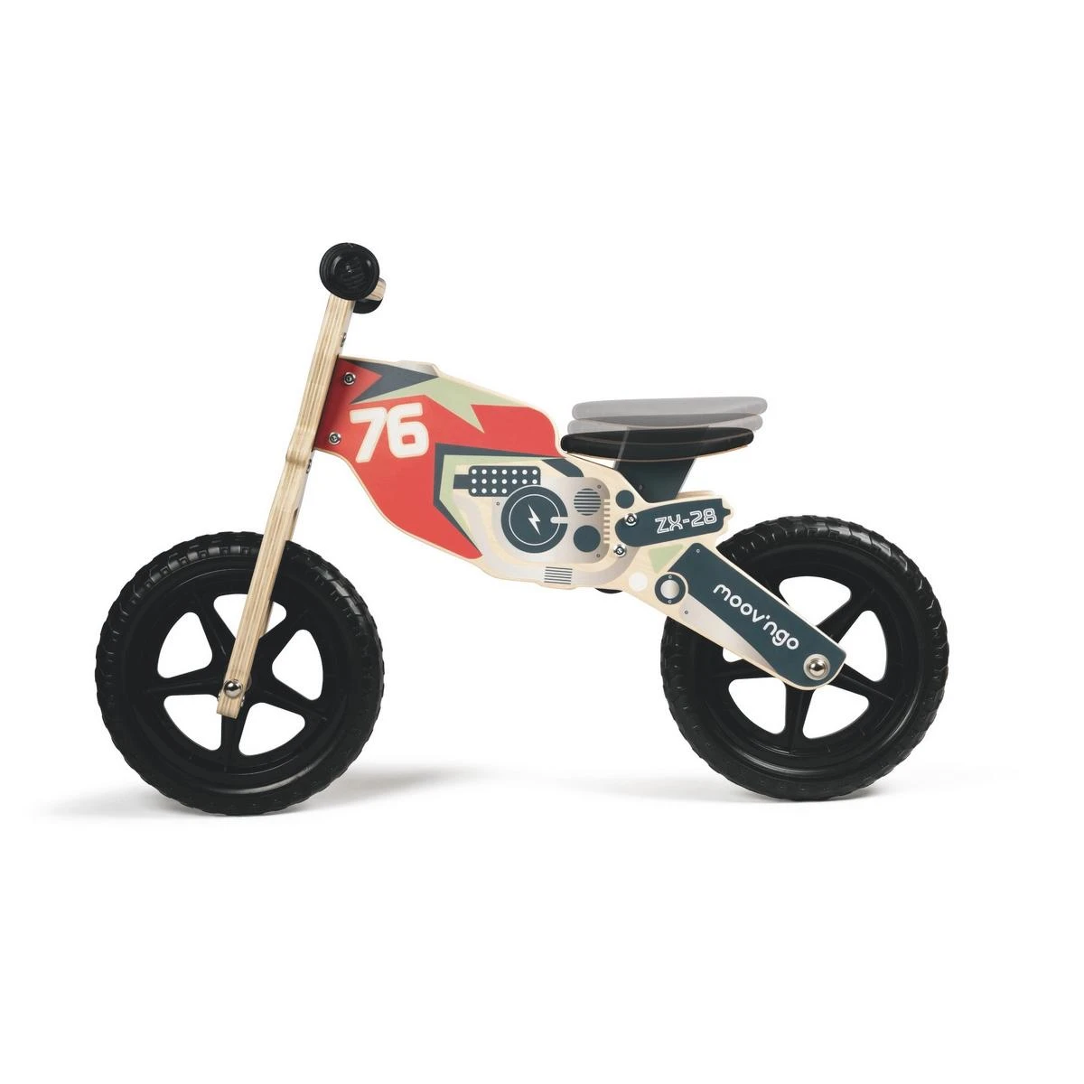 Cette draisienne moto cross FSC de Moov’ngo comprend un cadre en bois FSC avec pneus non gonflables.