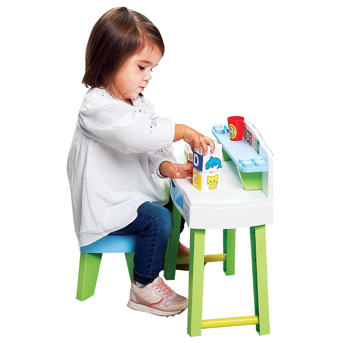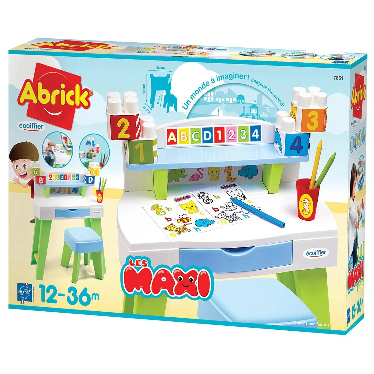 Mon premier bureau Les Maxi d’Ecoiffier est un bureau équipé d’un tiroir pratique pour ranger ses 6 accessoires : cahier de coloriage, pot à crayons et ses blocs de construction Maxi Abrick. Le tabouret inclus se range et se dérange facilement pour que votre tout-petit puisse vivre ses premières expériences de construction parfaitement installé. Il apprend les lettres et les chiffres pour un avant goût de l’école.