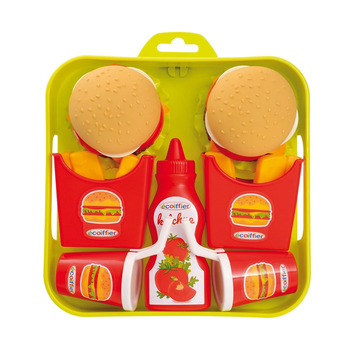 Comprend un plateau avec 2 hamburgers, 2 portions de frites, 2 boissons et 1 bouteille de ketchup. A partir de 18 mois. Origine France Garantie.