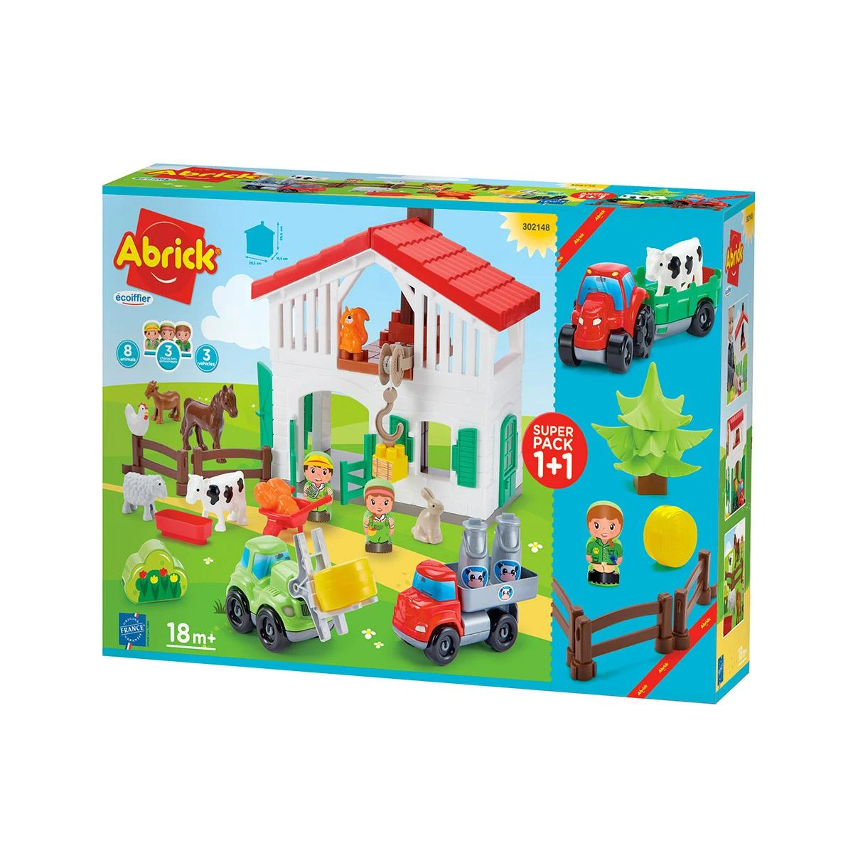 Votre enfant retrouve tout l’univers de la ferme dans le Super pack ferme Abrick d’Ecoiffier, de la maison du fermier aux 2 tracteurs en passant par les 8 animaux inclus et le camion pour livrer le lait.