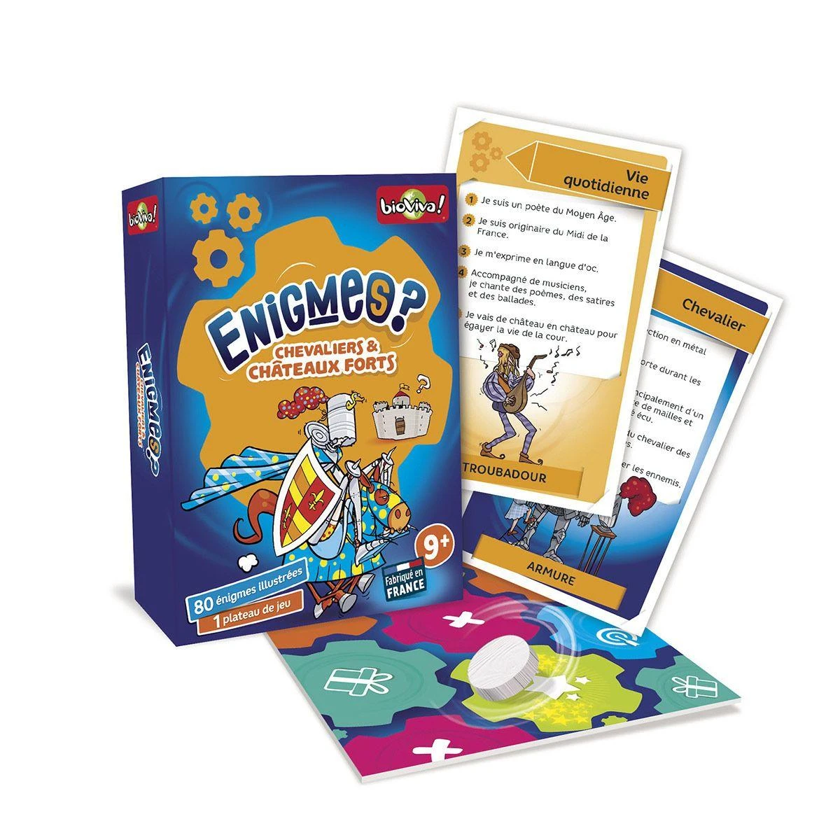 Biovivia met votre rapidité au défi avec le jeu Enigmes – Chevaliers et châteaux forts. Dans cette version chevaliers et châteaux forts, vous devrez résoudre les énigmes qui se cachent derrière les 5 indices. Attention à faire preuve d’adresse en lançant vos jetons sur le plateau pour gagner plus de cartes.