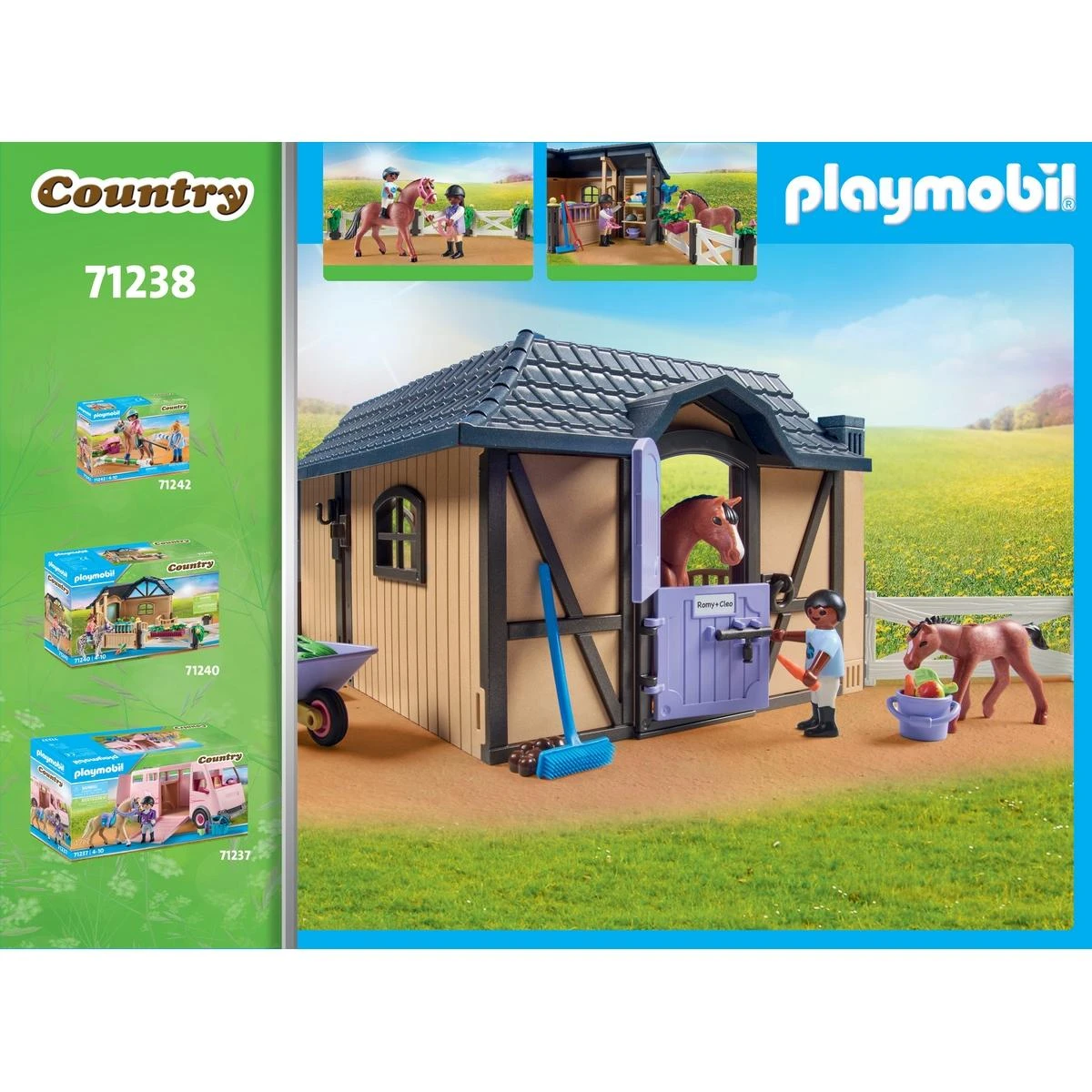 Le coffret Etable Carrière & Chevaux Playmobil Country 71238 est une invitation à créer pleins d’histoires dans l’univers préféré de votre enfant. Il joue seul ou à plusieurs. Le coffret Etable Carrière & Chevaux Playmobil Country 71238 contient : 3 personnages, 2 chevaux, 1 chien et les accessoires pour monter à cheval ainsi que pour l’entretien de l’étable et de la carrière. Une idée cadeau valeur sûre qui peut se compléter avec d’autres coffrets sur le même thème de l’équitation.