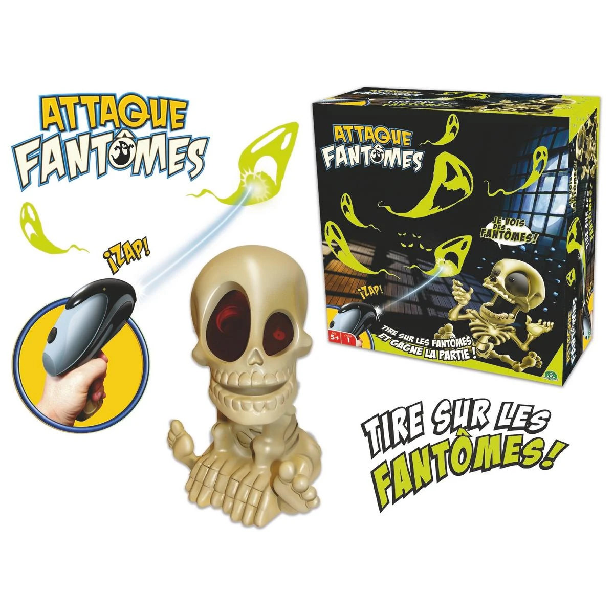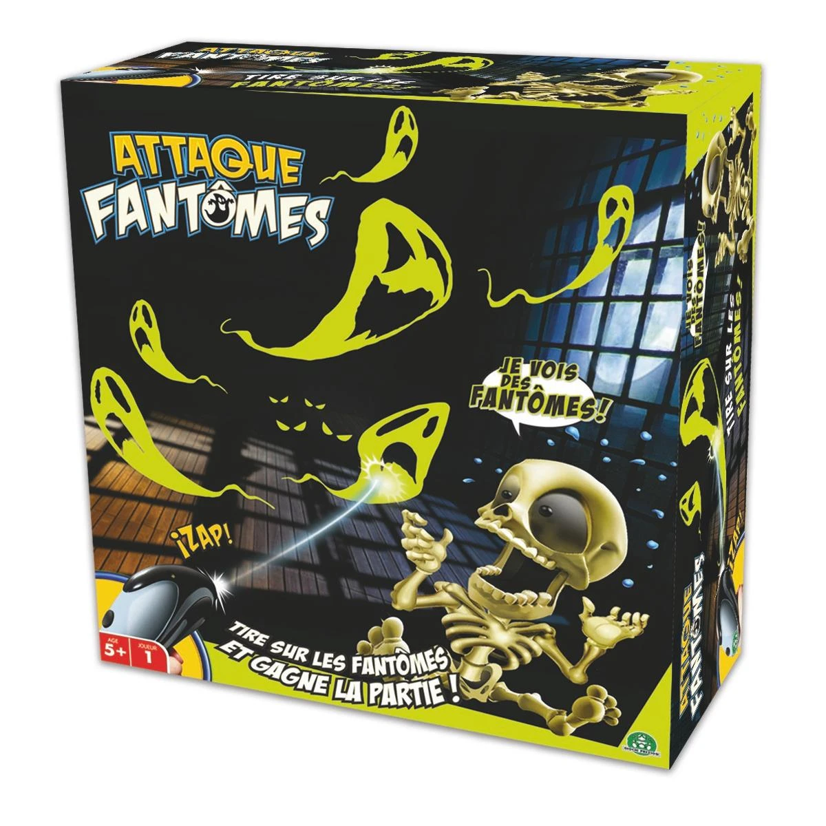 Ici, là, près du plafonnier, il y en a deux ! Attention aux fantômes : il vous faut les éliminer ! Tous ! Le jeu Attaque Fantômes est un jeu de tir sur des fantômes qui ne se joue qu’à un joueur. Le squelette aux effets spéciaux projette les cibles sur les murs et annonce les scores. Le principe du jeu ? Très simple. Il suffit de toucher le plus de fantômes possible avec le blaster fourni. Pour plus de challenge : il existe 3 niveaux de jeu, qui permettent à votre enfant de développer sa rapidité, sa dextérité et sa précision ! Ce jeu de société est idéal pour se divertir tout en faisant de l’activité physique. Attaque fantômes fonctionne avec des piles (non incluses) : projecteur 3x LR06 et Blaster 3x LR03. Que la chasse commence !