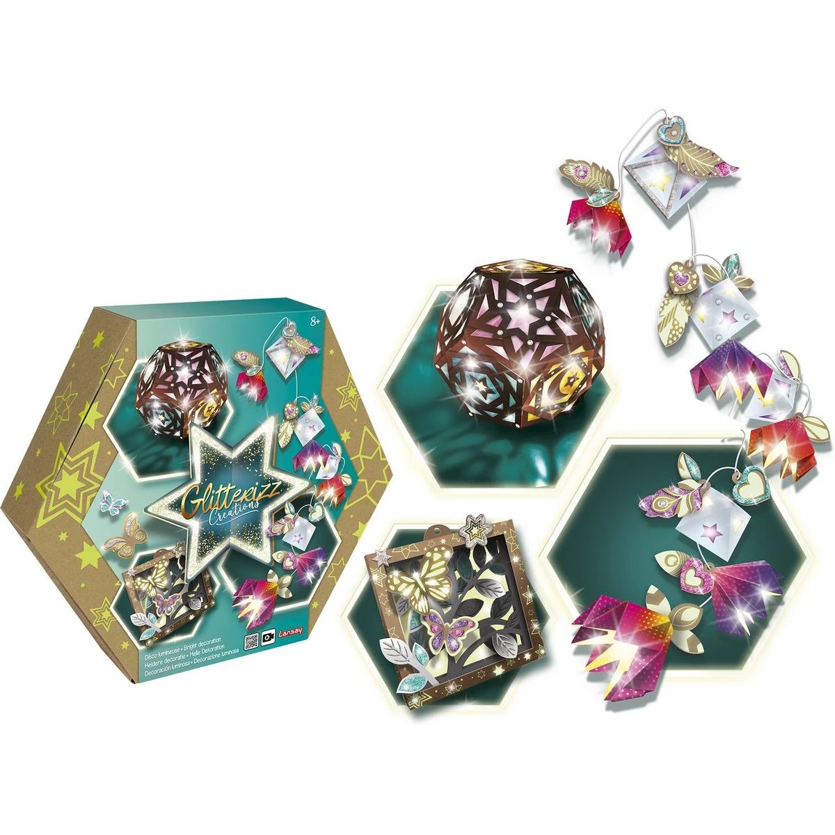Tiens ! Un nouveau jeu créatif et décoratif pour les petits. Les enfants aiment décorer leurs chambres avec leurs propres créations. Et quand l’objet en question brille dans le noir, c’est l’émerveillement total. Le Glitterizz Déco Phosphorescente est là pour réaliser ce rêve. Le petit peut créer de superbes réalisations lumineuses avec 3 projets différents. Il construit sa propre guirlande, assemble une déco vitrail bien original et unique, et puis, il fabrique un cadre lumineux authentique.