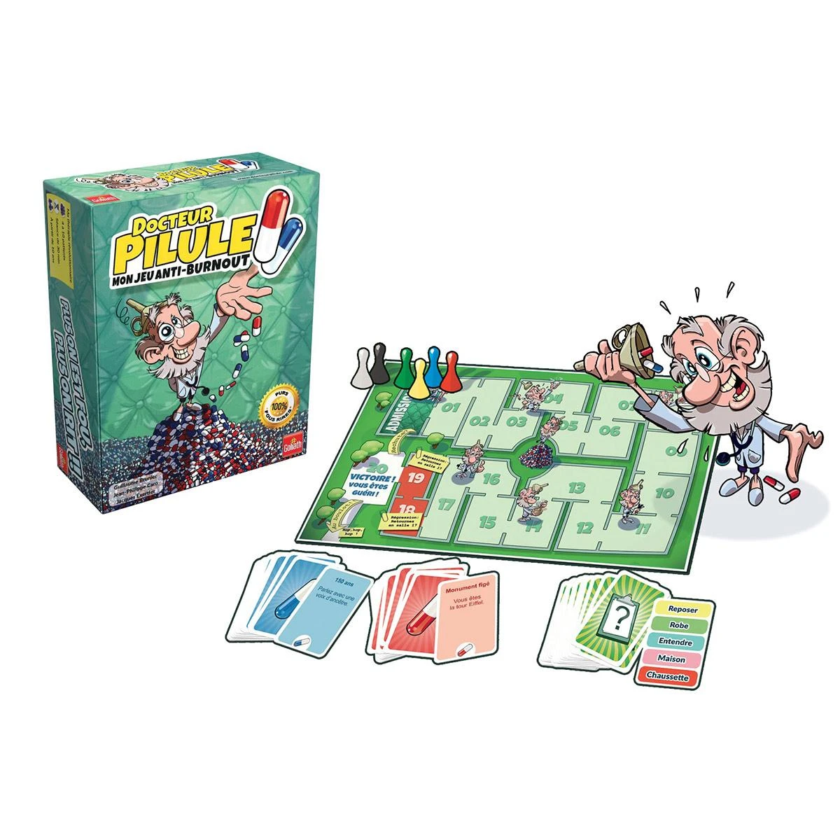 Contenu : 1 plateau de jeu, 6 pions, 55 pilules rouges, 55 pililles bleues, 110 cartes mots.