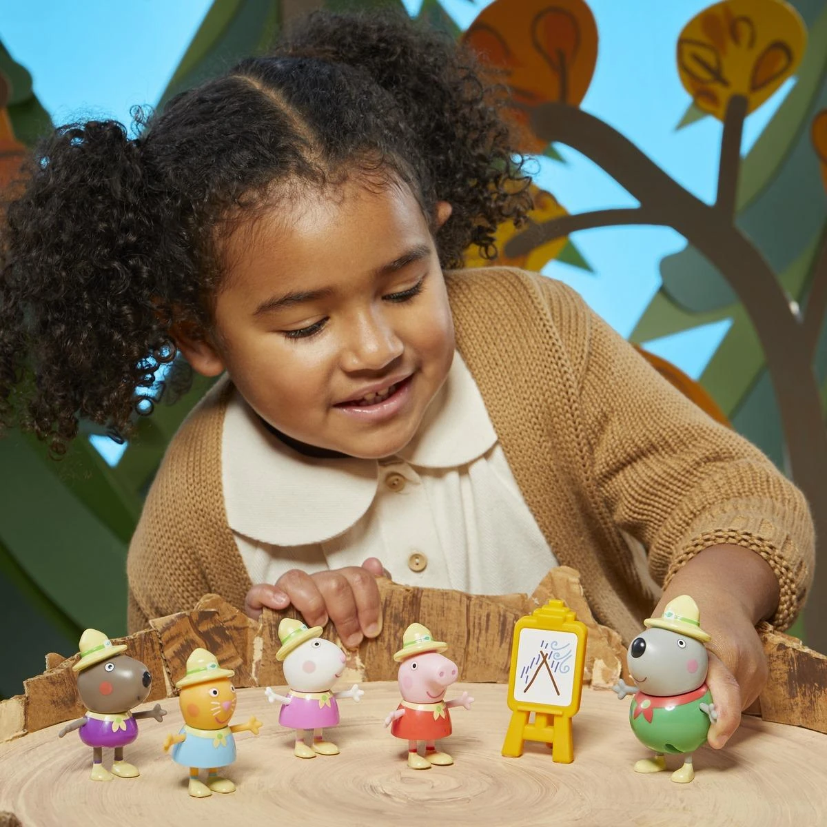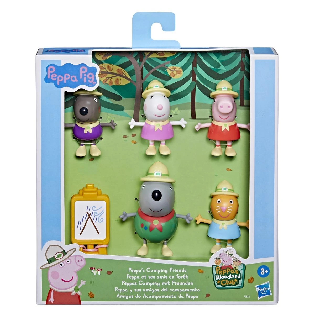 Le Coffret figurines Peppa Pig et ses amis en forêt comprend 6 pièces de jouets dont 4 figurines de 7,5 cm (Peppa Pig, Suzy Sheep, Candy Cat et Danny Dog), une figurine de 10 cm (M. Wolf), et un chevalet coloré. Tous ces personnages portent leur uniforme du Club dirigé par M.Wolf qui prévoit de faire un camping. Mais avant cela, ils se réunissent autour du chevalet pour écouter les explications du chef sur les règles du bon campeur, et ce dernier en profite pour leur transmettre quelques connaissances du camping en forêt.