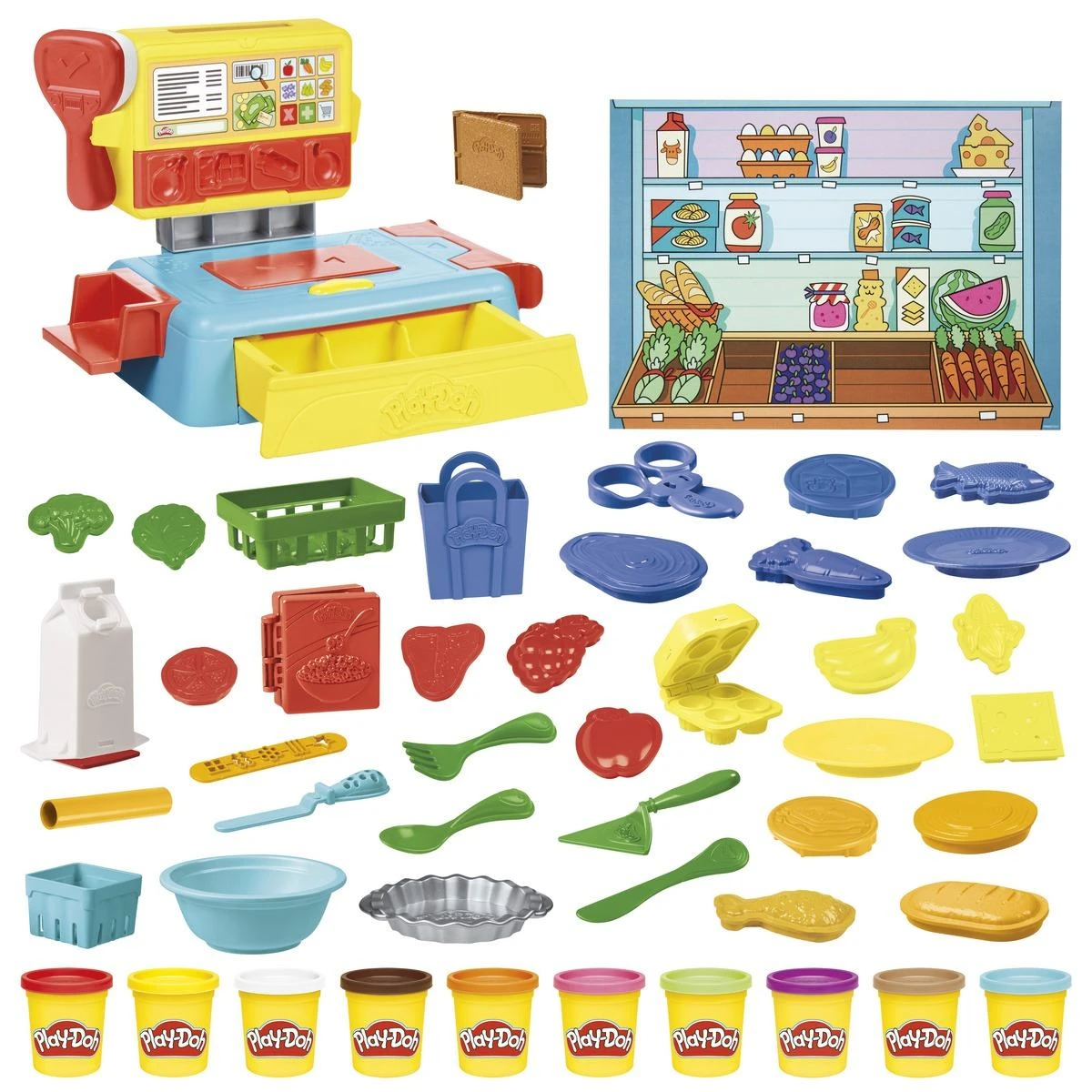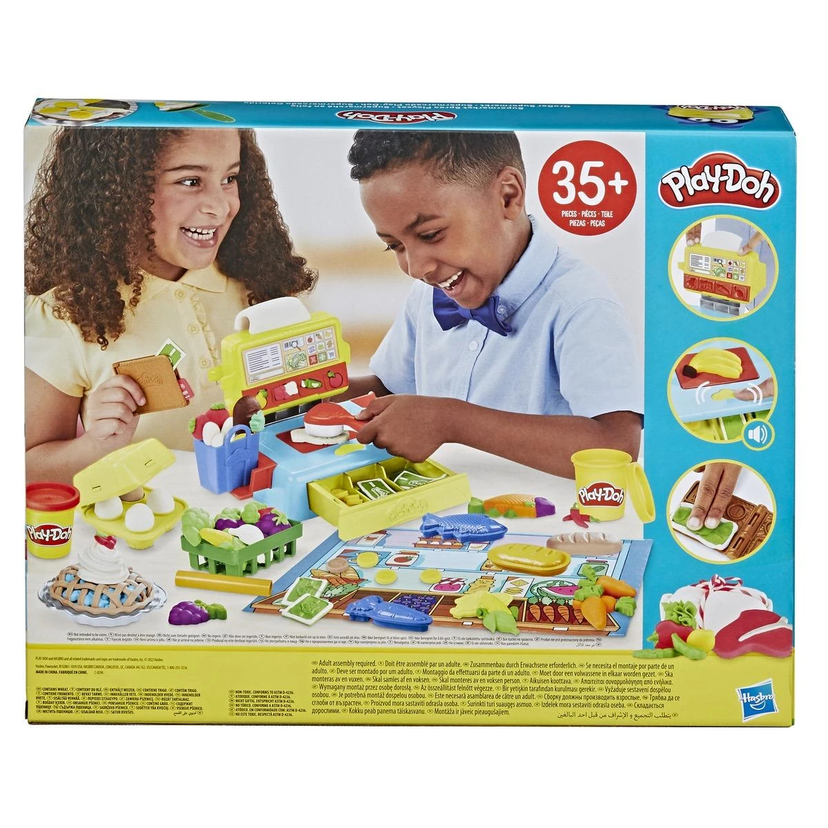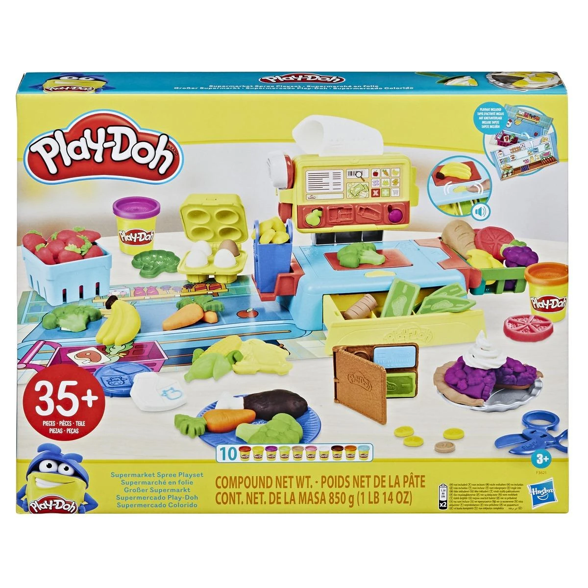 Ô les savoureux aliments ! Et tout ce choix pour faire ses courses ! Recréé avec la pâte à modeler Play Doh et tous les accessoires contenus dans le coffret Supermarché Play Doh un super assortiment de produits ! Le coffret Supermarché Play Doh d’Hasbro comprend 35 pièces dont 1 tapis d’activité, 10 pots de pâte à modeler et de nombreux accessoires. On adore les effets sonores qui rajoutent au plaisir du jeu. Fonctionne à piles non incluses. Et n’oublie pas de faire passer Papa à la caisse !