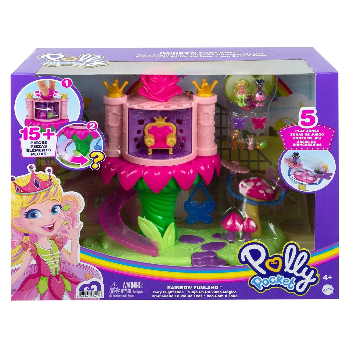 Le coffret Polly Pocket : Le monde féerique des princesses de Mattel est un coffret avec un décor à thème représentant un château enchanté doté d’une tourelle qui tourne pour faire descendre 15 surprises (les enfants pourront recharger le distributeur autant de fois qu’ils le souhaitent).