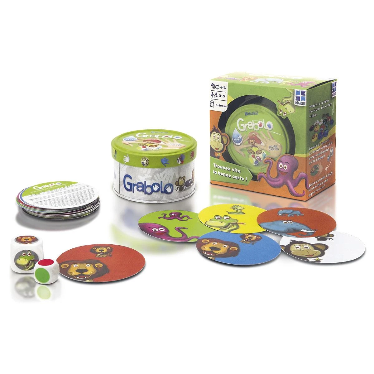 As-tu le meilleur coup d’œil ? Il y a un dé pour six animaux et un dé pour six couleurs. Toutes les cartes « animal » sont posées sur la table. Dès que les dés ont été lancés, le premier joueur qui retrouve la carte qui combine l’animal et la couleur indiqués par les dés gagne cette carte. Quand il n’y a plus de carte sur la table, la partie est terminée. Celui qui a le plus de cartes a gagné ! Grabolo de MEGABLEU est un jeu d’observation et de rapidité pour petits et grands, dans une boite métal facile à transporter.