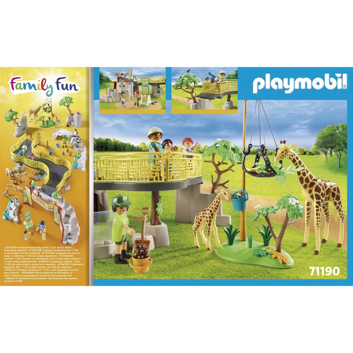 Bienvenue dans la ménagerie Playmobil ! Ici, chaque rencontre est une surprise. Une découverte. Un apprentissage. Tous les animaux peuvent être observés de près. Une passerelle au-dessus du portail d’entrée mène les visiteurs vers le sentier d’observation. Dans la Ménagerie Playmobil Familly Fun 71190, on peut observer les pingouins et les girafes dans leurs grands enclos ! Trop mignon ! Le gardien de la ménagerie apporte de la nourriture et de l’eau aux girafes. Tiens, regarde : les pingouins glissent dans le toboggan de glace !