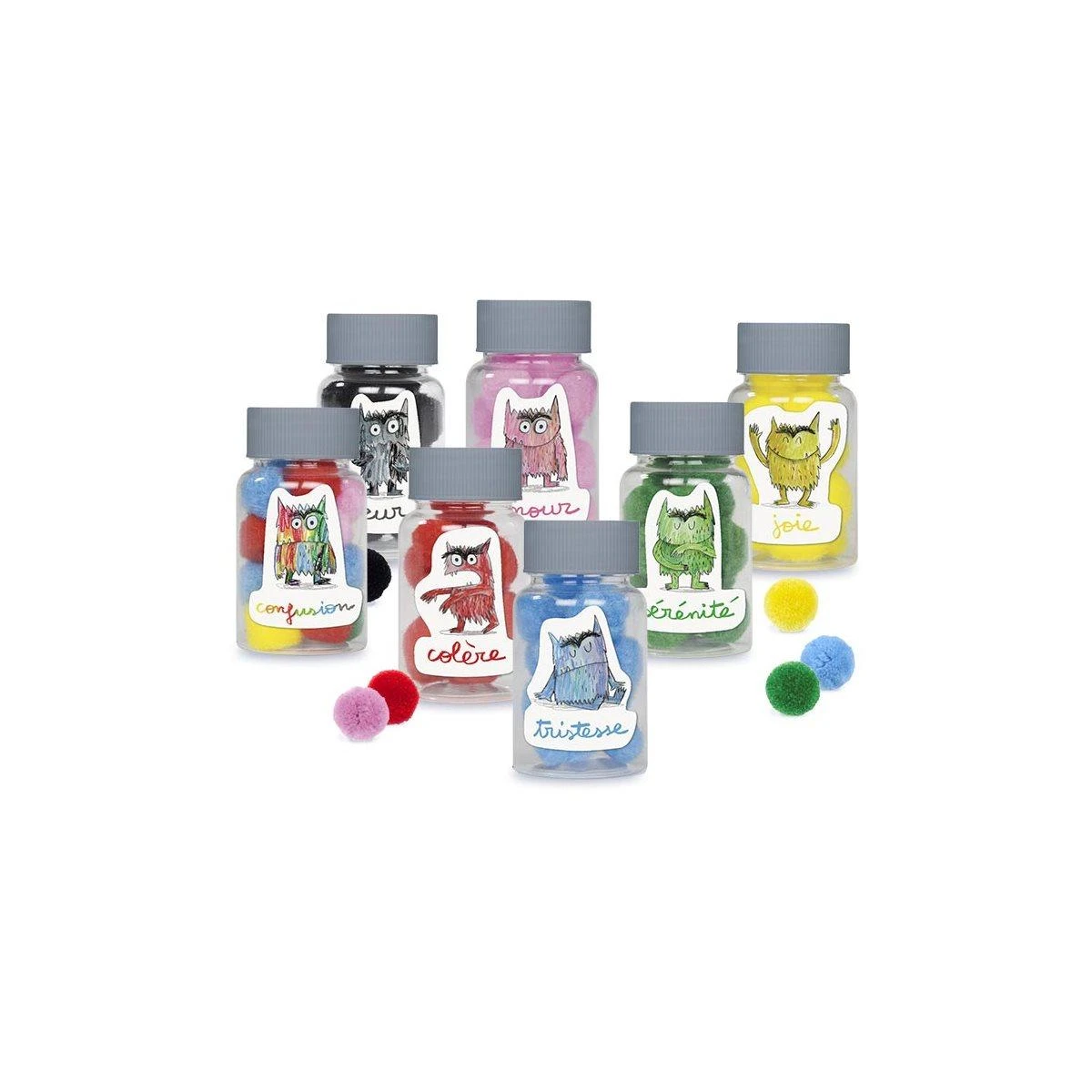 Contenu : 14 grandes cartes découverte (11 x 16,5 cm), 1 roue des émotions (diamètre 19 cm) avec flèche tournante, 1 miroir (9 x17 cm), 7 flacons (hauteur 8 cm) avec étiquettes à coller et 120 pompons (20 de chaque couleur), 1 tableau magnétique (20 x 19 cm) et 33 magnets, 10 grandes cartes yoga (11 x 16,5 cm), 1 guide de 20 pages.