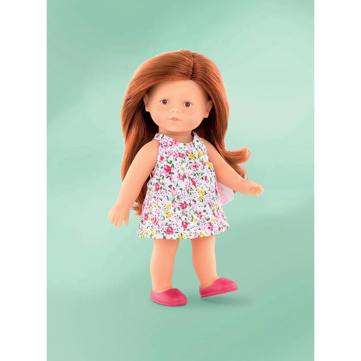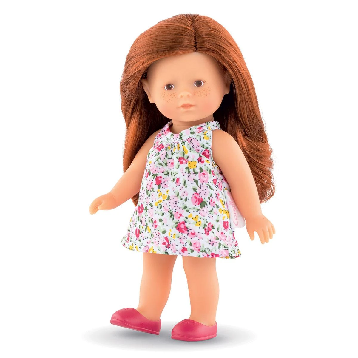Mini Corolline Ruby de Corolle est une petite poupée de 20 cm « prête à offrir ». Elle a un corps tout en vinyle doux au toucher et à la délicate senteur de vanille. Ses yeux noisette sont peints sur son visage constellé de tâches de rousseur. Elle a des cheveux roux longs et soyeux pour faciliter le coiffage. Elle est habillée d’une robe fleurie « trois trous », d’une culotte et d’une paire de chaussures moulées assorties.