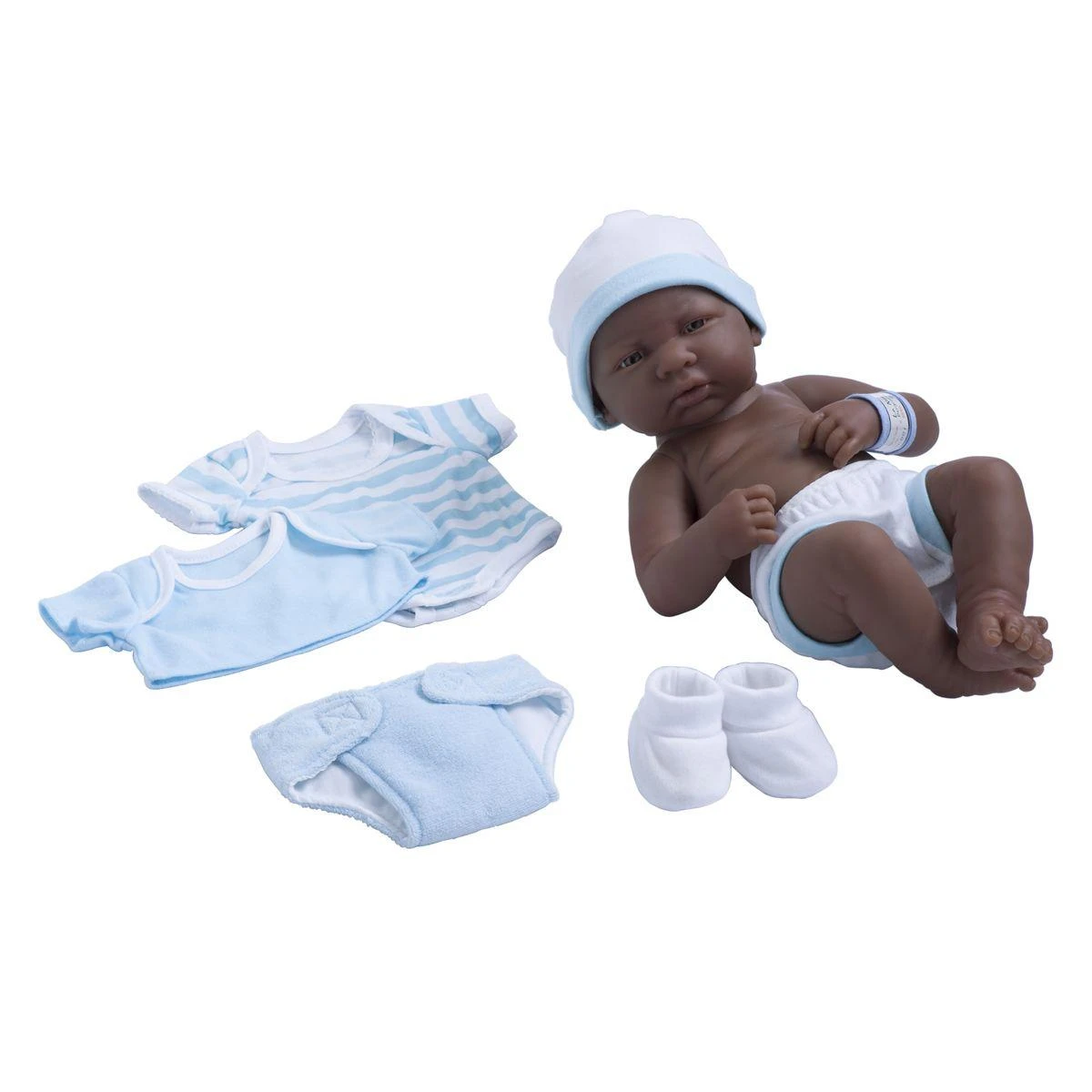 Poupon Calinou métissé réaliste et sexué d’une hauteur de 38 cm. Des vêtements sont inclus dans la boîte. Existe en fille ou garçon.