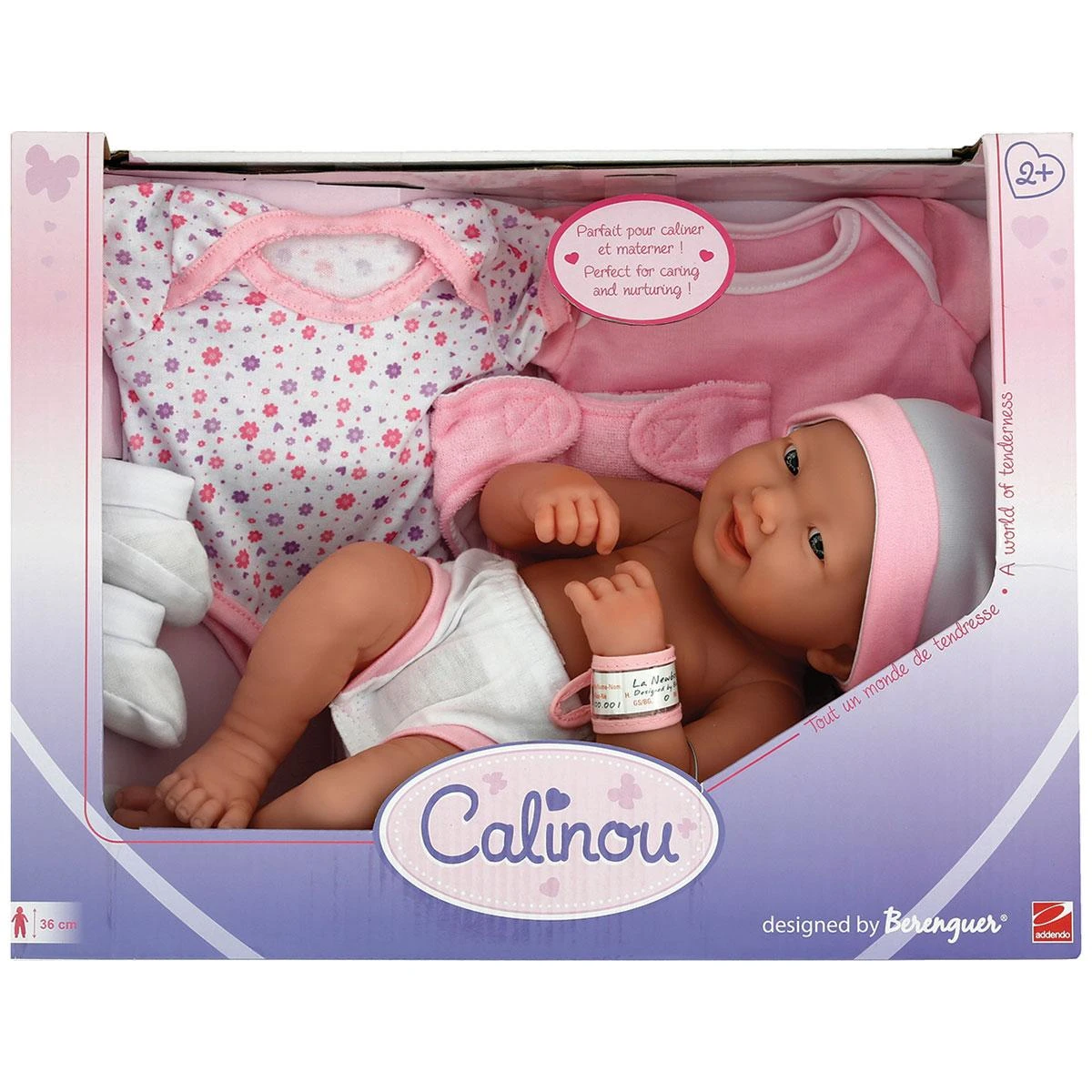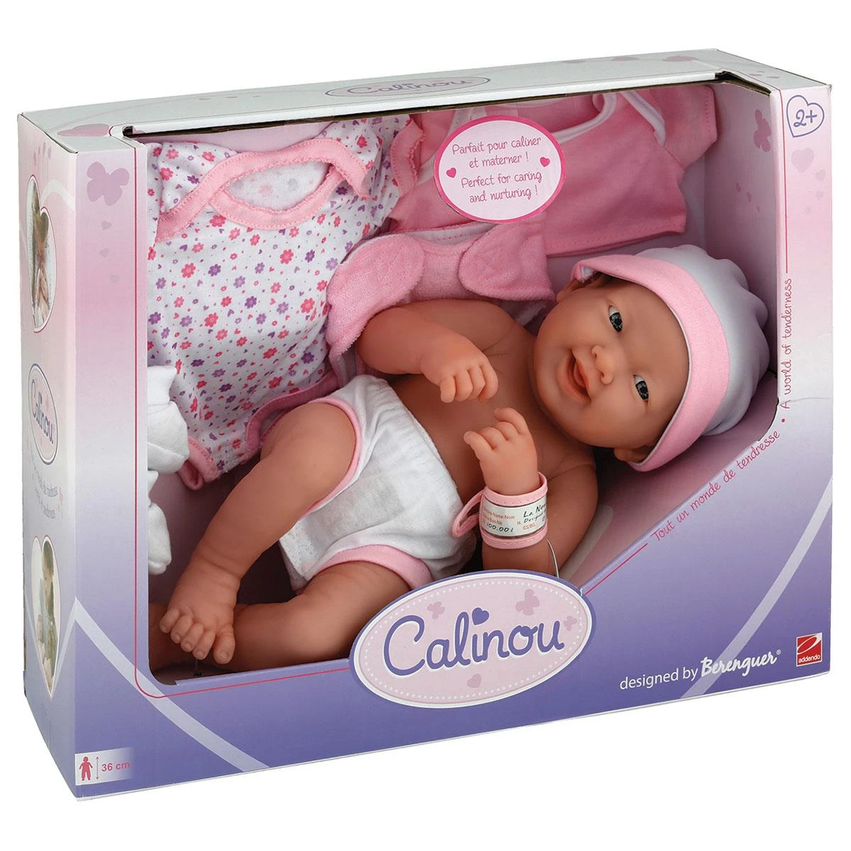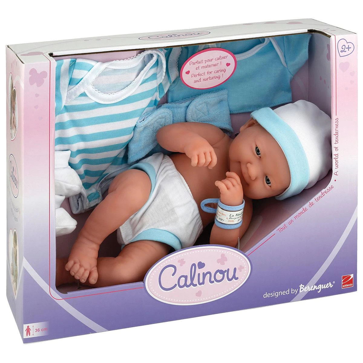 Poupon Calinou nouveau-né sexué de 38 cm. Avec accessoires. Existe en fille ou garçon.