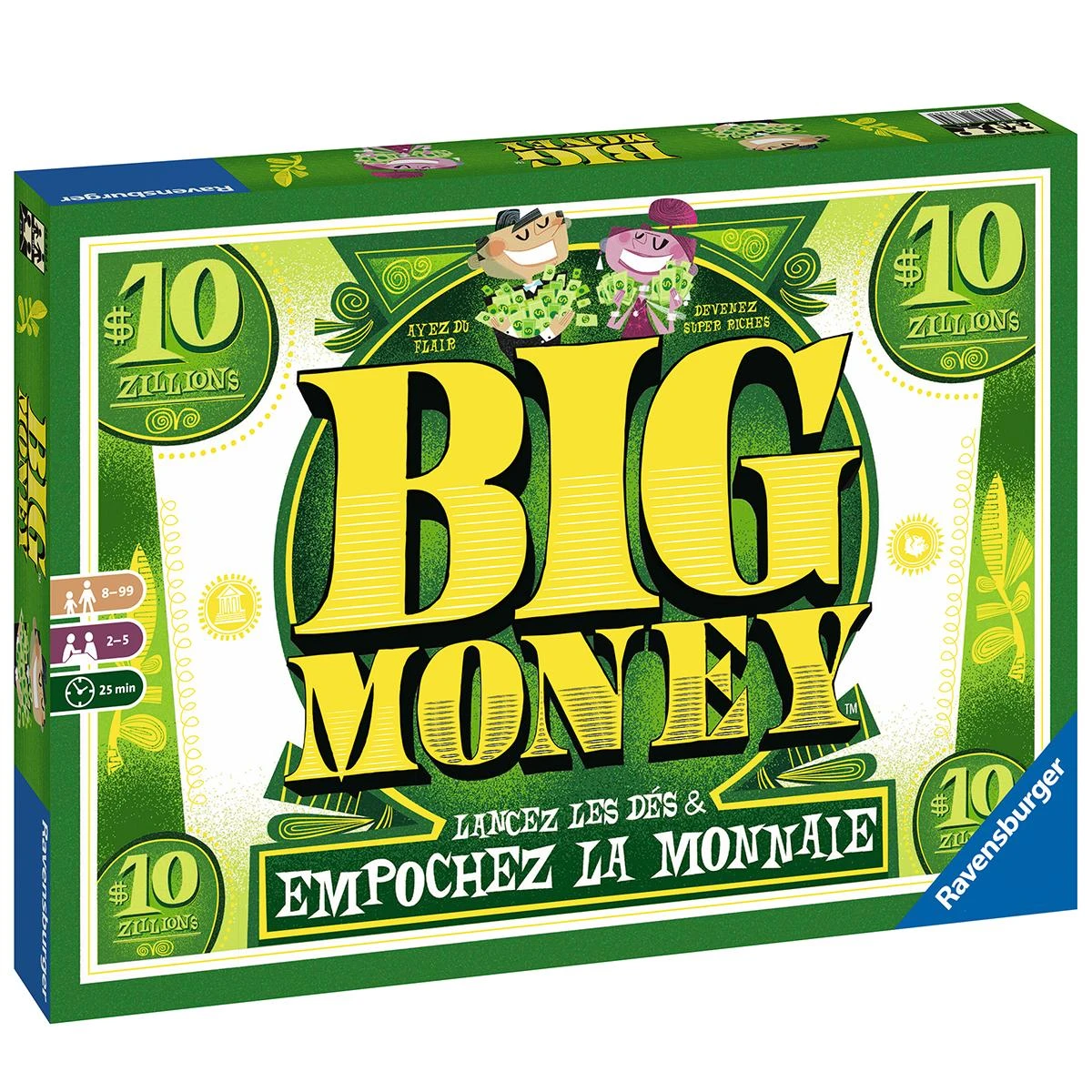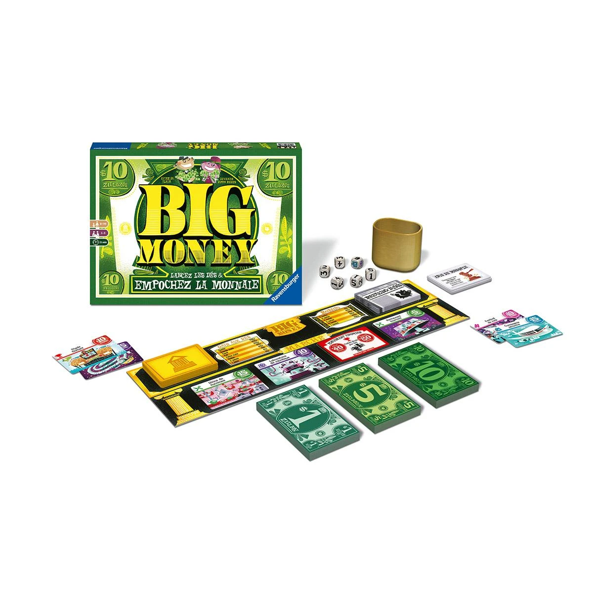 Dans le jeu Big Money de Ravensburger, amassez des sommes colossales … et soyez le plus riche à la fin ! Lancez les dés jusqu’à 3 fois et récupérez un max d’oseille : un full vous rapportera 15 Zillions, une grande suite 25 ! Ayez du flair et investissez dans les affaires qui rapportent pour développer votre empire. Allez-vous miser sur votre équipe de foot préférée, un fabuleux parc d’attraction ou un nouveau studio de cinéma ? À vous de décider ! À vous de prendre les bons risques, car seul le plus riche l’emportera ! Avez-vous l’étoffe d’un zillionnaire ?