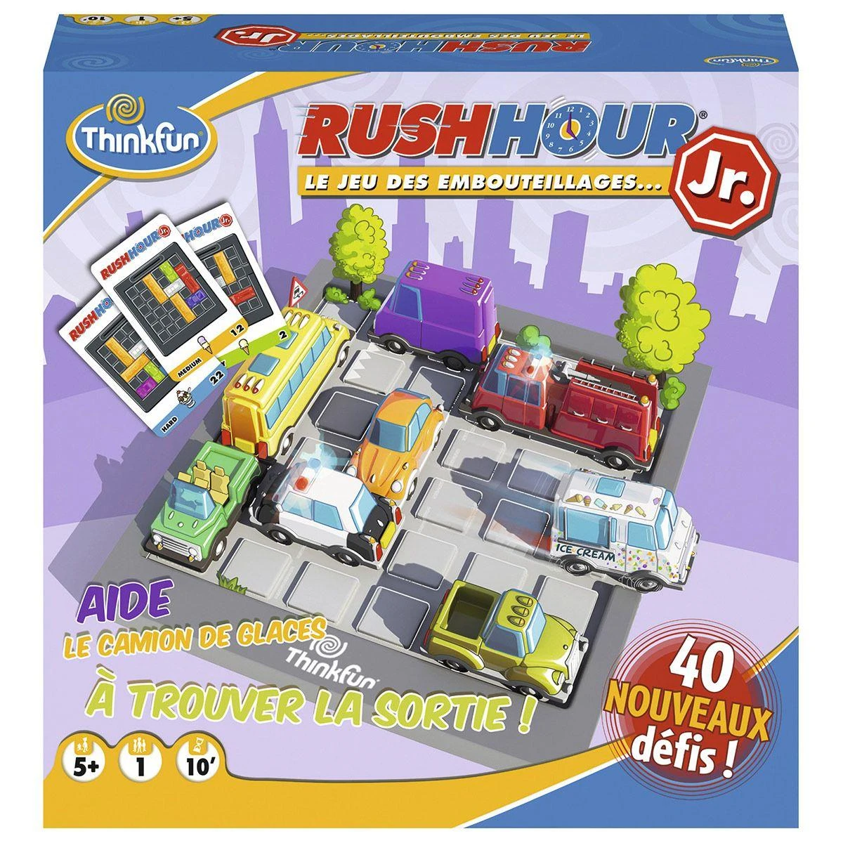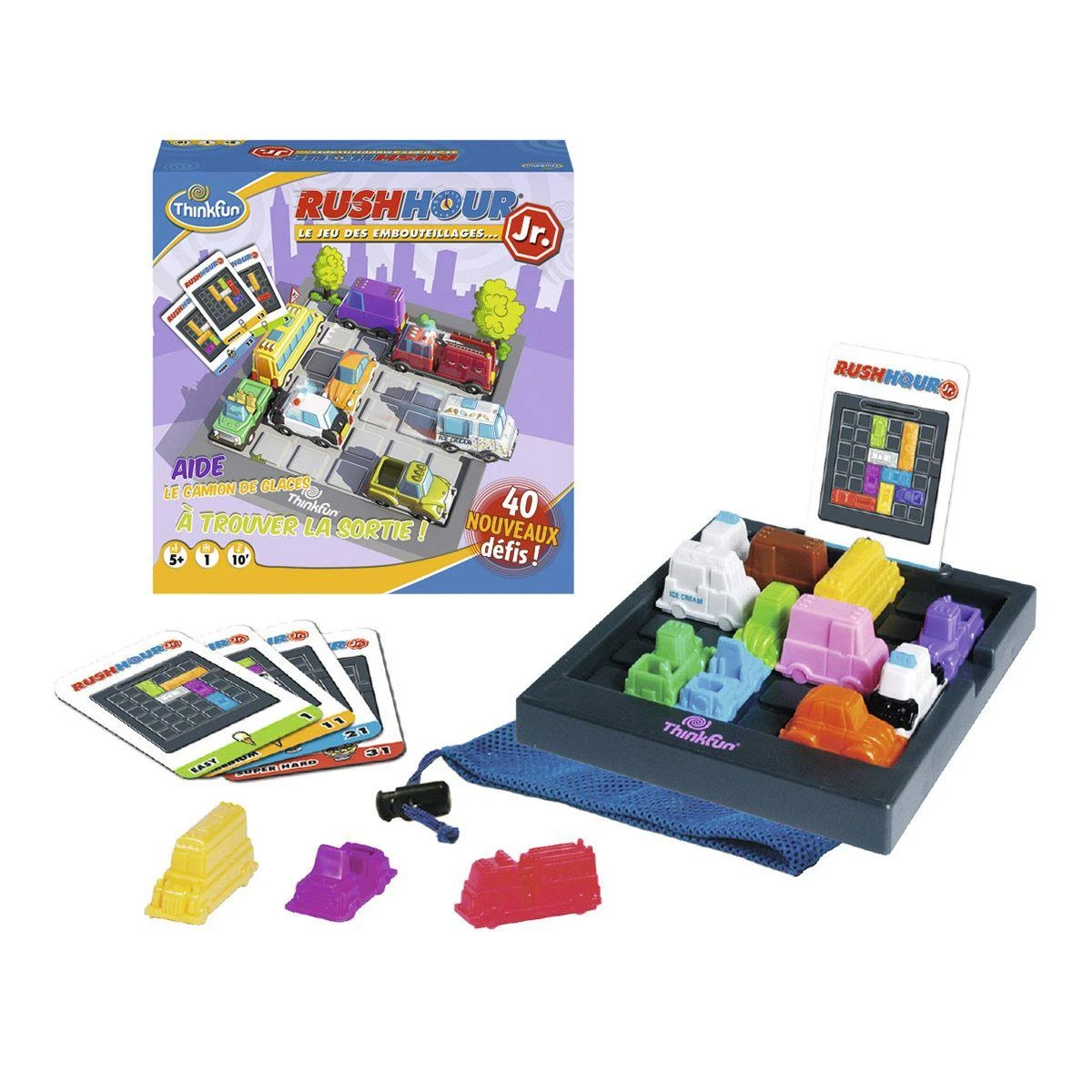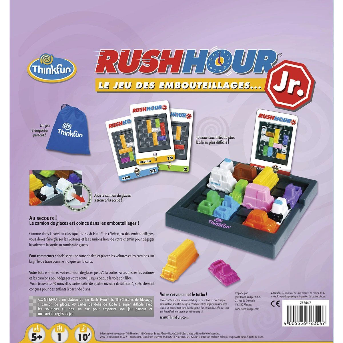 Contient un plateau de jeu Rush Hour® Jr, 15 véhicules de blocage, 1 camion de glaces, 40 cartes de défis de facile à super difficile avec les solutions au dos, un sac pour emporter son jeu partout et un livret de règles du jeu.