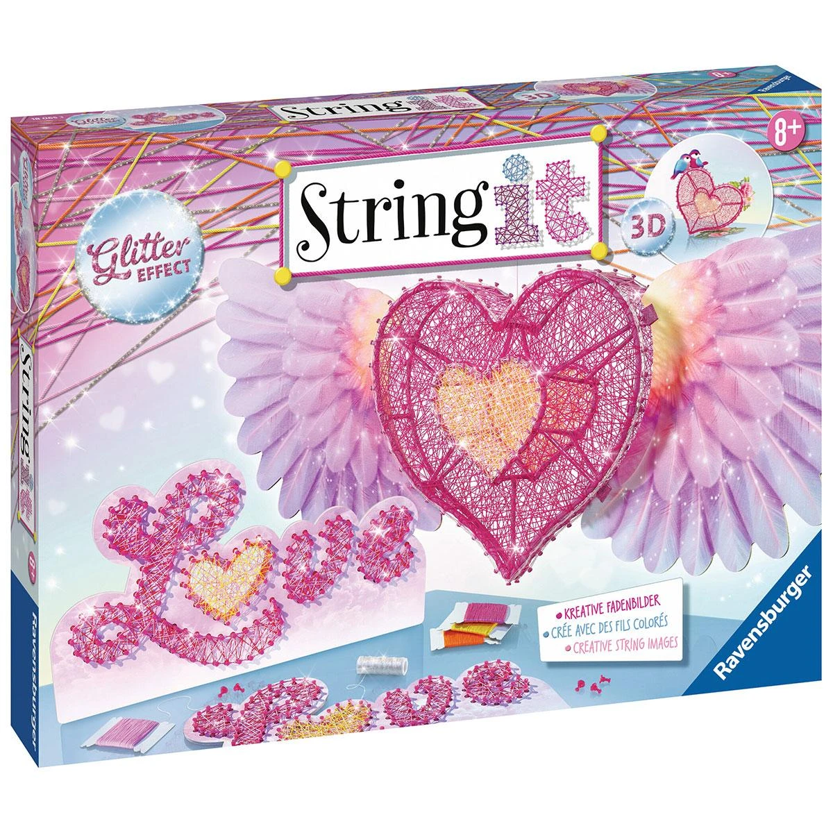 String It de Ravensberger est un kit DIY (Do It Yourself : fait soi-même) pour créer son cœur en 3D ! C’est facile grâce à ce kit de sculpter des formes et de réaliser ses créations en fils dans une nouvelle dimension ! La structure montée, il ne reste plus qu’à entrelacer les fils, dans le sens que l’on veut, pour découvrir un superbe cœur tissée. Le choix des couleurs de fil est libre et l’activité simple pour permettre à chacun d’exprimer sa sensibilité artistique. La réalisation terminée elle pourra décorer et personnaliser une chambre à merveille et comme le fil est pailleté, effet glamour garanti !