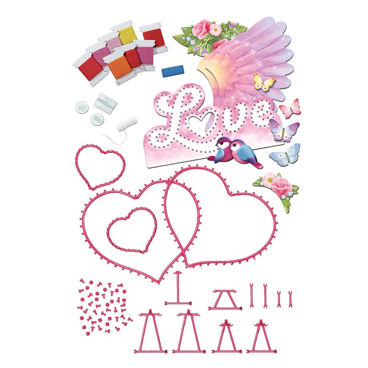 Contient : 1 cœur en 3D, 1 tableau « love », 3 pieds de montage , 210 épingles en plastique, 1 poussoir, du fil , du fil pailleté, divers accessoires , 1 notice.