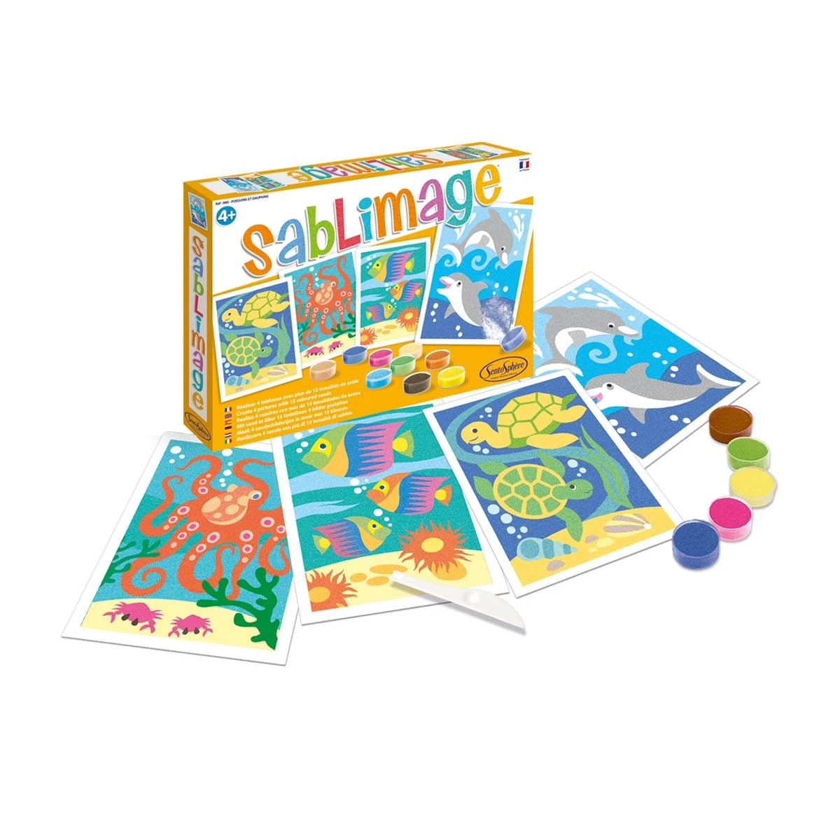Le monde sous-marin est un univers merveilleux pour les plus petits. Encouragez leur créativité avec la palette de couleurs des différents sables du coffret Sablimage – poissons et dauphins de Sentosphère.