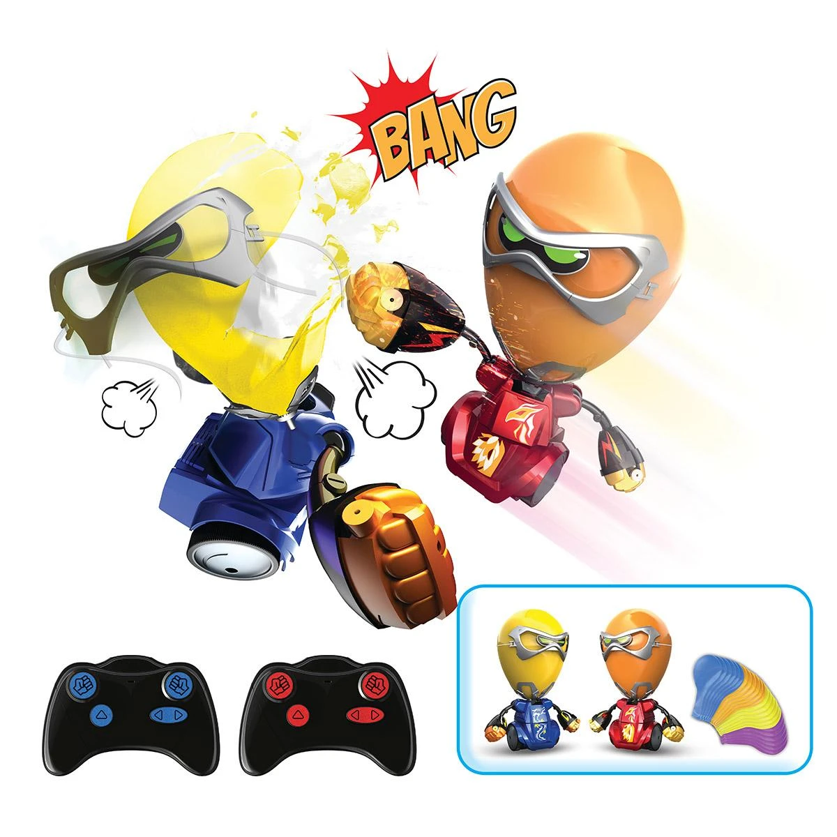 Les Robots Kombat Balloon radiocommandés de Silverlit ont une particularité : leurs têtes explosent ! Dans ce pack, 2 robots télécommandés inclus avec des ballons à la place de la tête ! Sois le premier à faire exploser la tête de ton adversaire grâce à des coups de poings surpuissants ! Pour encore plus de fun, tu peux organiser des combats jusqu’à quatre joueurs en simultané ! Effets sonores et lumineux. 2 lunettes et 24 ballons inclus. 2 couleurs différentes.