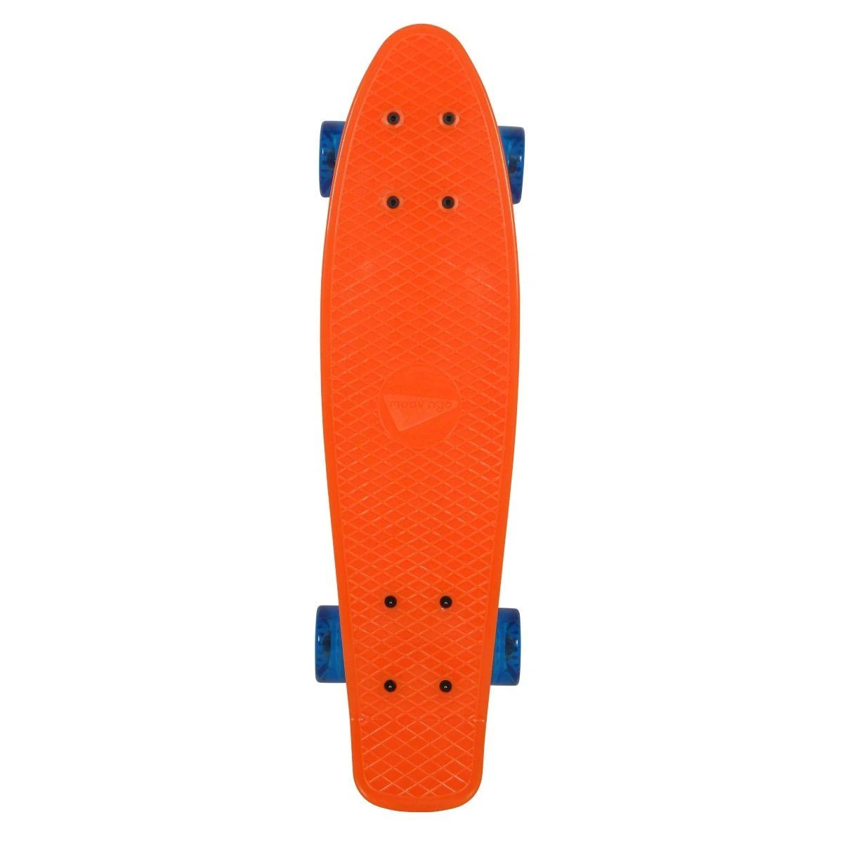 Skate vintage orange avec roues bleues. Deck en plastique semi rigide, truck en aluminium haute résistance, grandes roues souples de 60 X 45 mm, et roulements ABEC 5. Poids maxi : 100 kg. Taille : 57,5 cm.