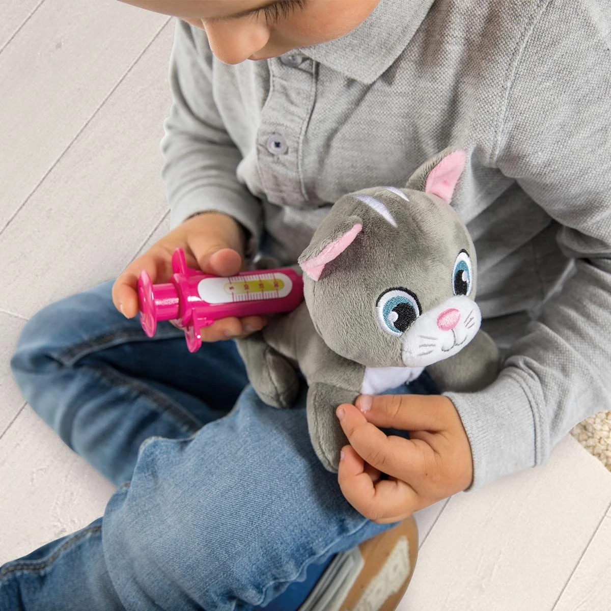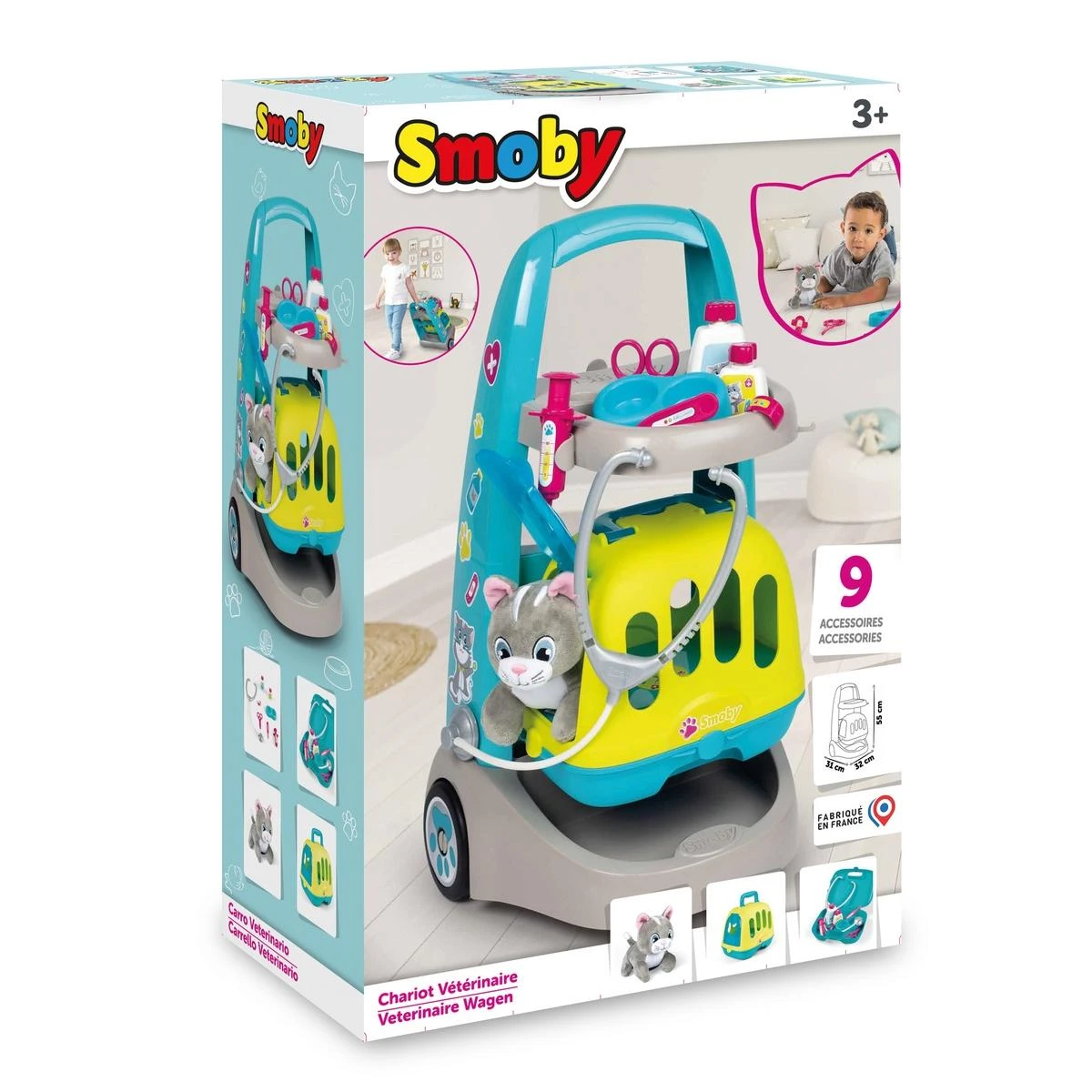 « Rex », le roi des chats de Rémi a mal à la tête. « King » le champion olympique de chasse aux chaussons a les oreilles qui grattent. Pas de problème : votre enfant peut intervenir rapidement avec son chariot de vétérinaire ! Le Chariot Vétérinaire de Smoby inclut de nombreux accessoires : 1 seringue, 1 thermomètre, 1 stéthoscope, 1 paire de ciseaux, 1 gamelle, 2 flacons (sirop, shampoing), et 1 bracelet. 1 peluche chaton non électronique est incluse, ainsi qu’une mallette 2 en 1. La porte translucide de la cage possède une ouverture pour pouvoir voir le chat quand il est à l’intérieur. Une poignée sur le dessus de la cage permet de la transporter partout. Il y a la possibilité d’ouvrir la mallette avec la cage au-dessus, d’enlever le haut de la cage pour l’utiliser en simple mallette de vétérinaire et de ranger les accessoires à l’intérieur. Génial non ? Bon à savoir : le Chariot Vétérinaire est fabriqué en France.