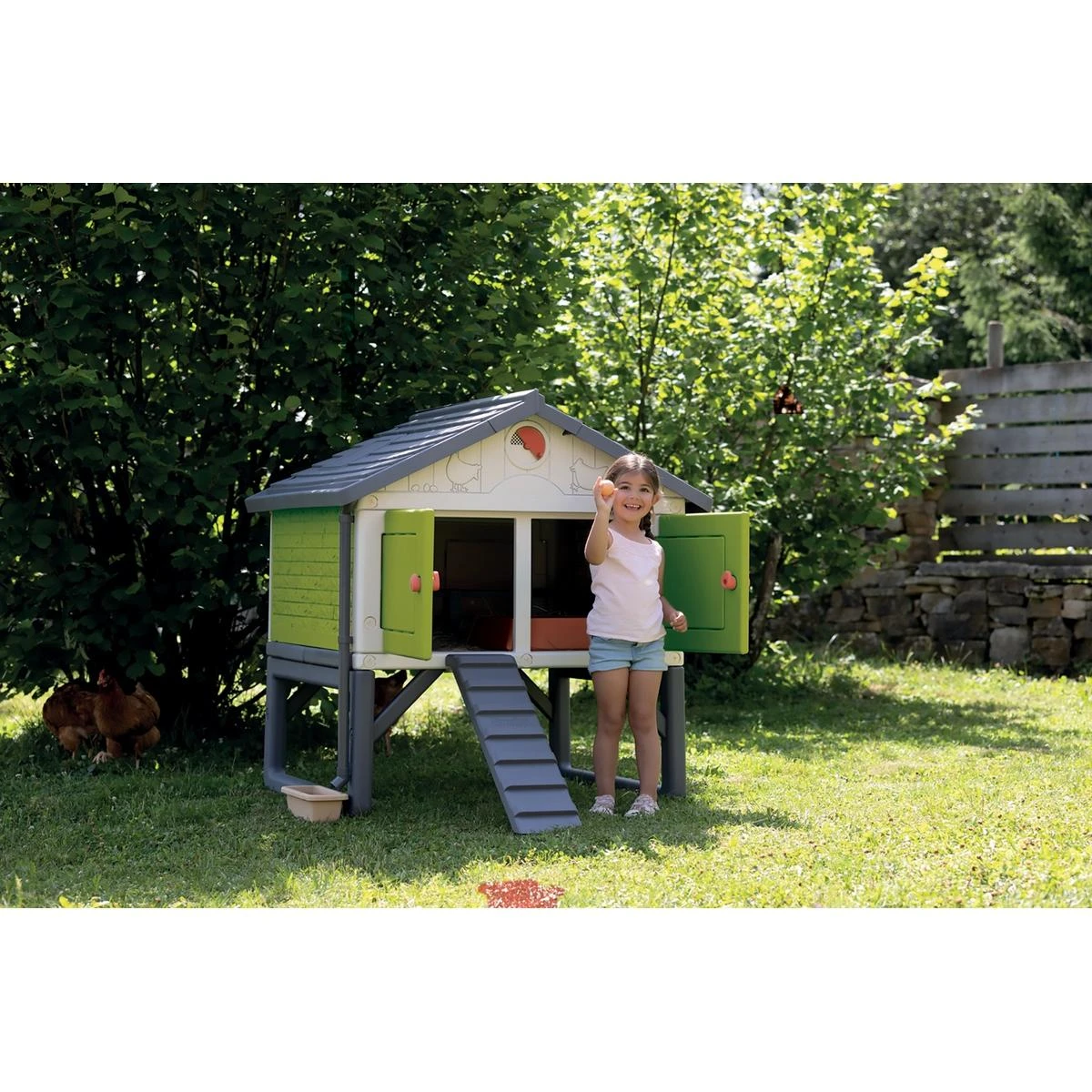 Le Cot Cot Cottage – poulailler de la marque SMOBY est un poulailler de qualité, pratique et très sécurisé pour les poules. Sa structure stable et résistante avec des portes, un plancher et des pieds en plastique soufflé traités anti-UV garantit un confort optimal pour vos poules. Il comprend des équipements bien pensés tels qu’une rampe d’accès, un pondoir, un perchoir, une ventilation réglable et une descente d’eau avec récipient pour récupérer l’eau de pluie. Il est facile à nettoyer grâce à sa structure en plastique et ses grandes portes, et peut être déplacé facilement grâce à ses pieds adaptés. Il est livré en 2 colis avec un œuf factice et un livret ludique à l’intérieur.