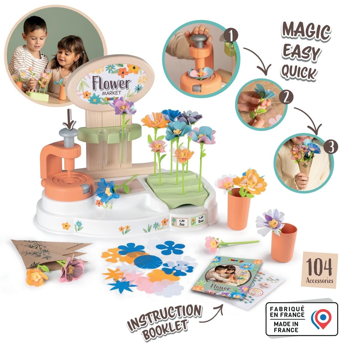 Bienvenue au marché aux fleurs de Smoby ! Ici, les fleurs sont faites maison. Votre enfant les crée facilement à l’aide de la machine et compose de charmants bouquets.